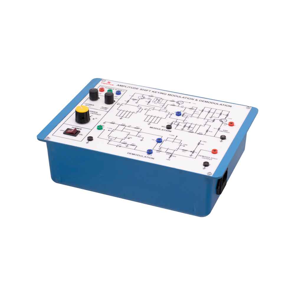 This Instrument is designed to demonstrate the method to transmit signals via. Electromagnetic transmission and to study the Amplitude shift keying Modulation and Demodulation. The whole instrument is placed in the plastic moulded box and 2 mm banana plug leads are provided for modulation and demodulation connections.