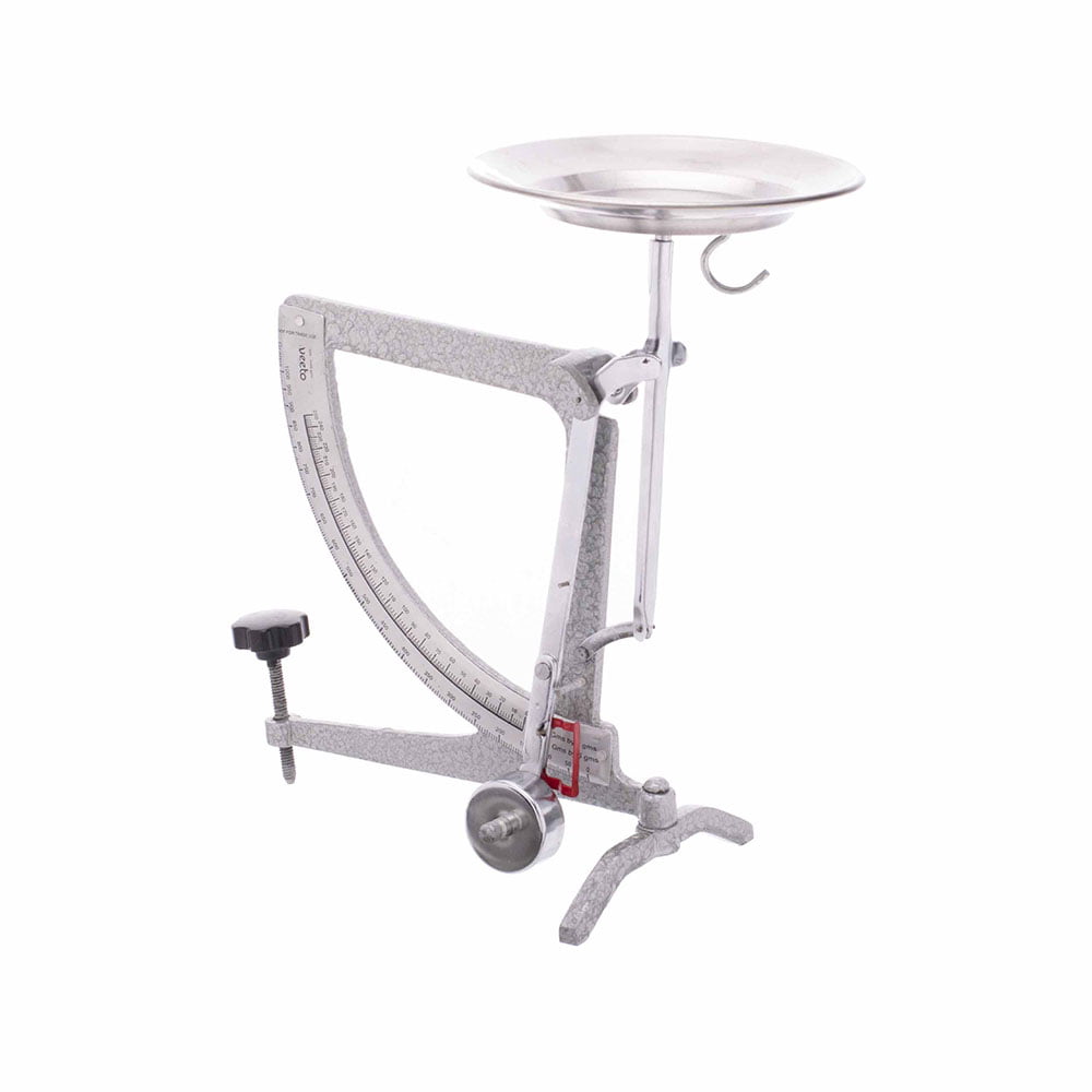 A simple single pan balance with two ranges 0-250 x 1 gm and 0-1000 x 5 gm. Die-cast aluminum alloy frame, other parts are chrome plated. With leveling screw to set zero and a pointer for reading without parallax error. With a detachable pan having a hook for experiments on specific gravity.