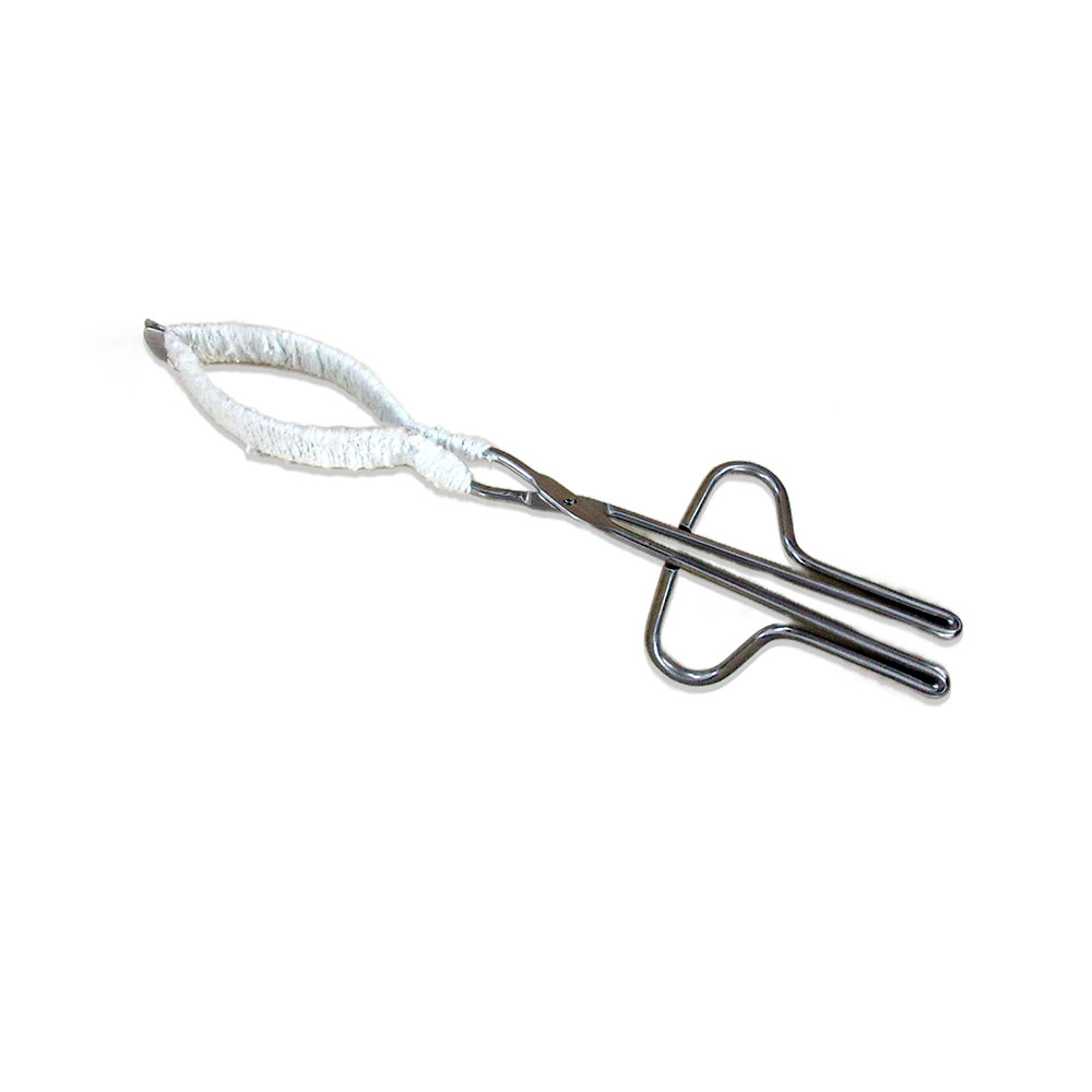 For hot beakers from 100 to 1500 ml capacity. Stainless steel with riveted joint and fiberglass-covered jaws. Length : 12 ½”.