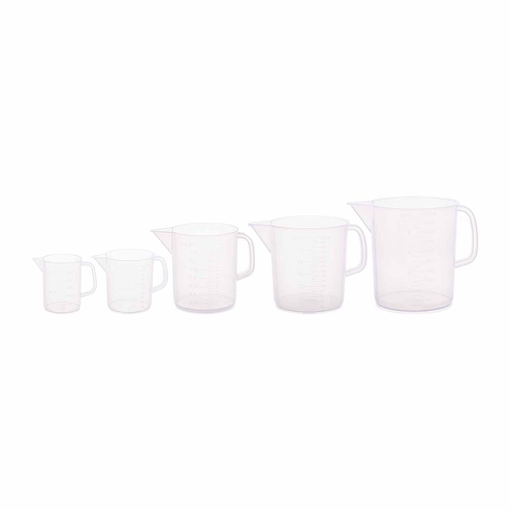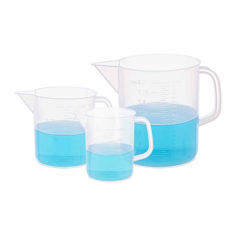 Polypropylene, autoclavable and have non-drip spout. These jugs have raised graduations, provide excellent contact clarity & are provided with excellent thumb grip on handle.