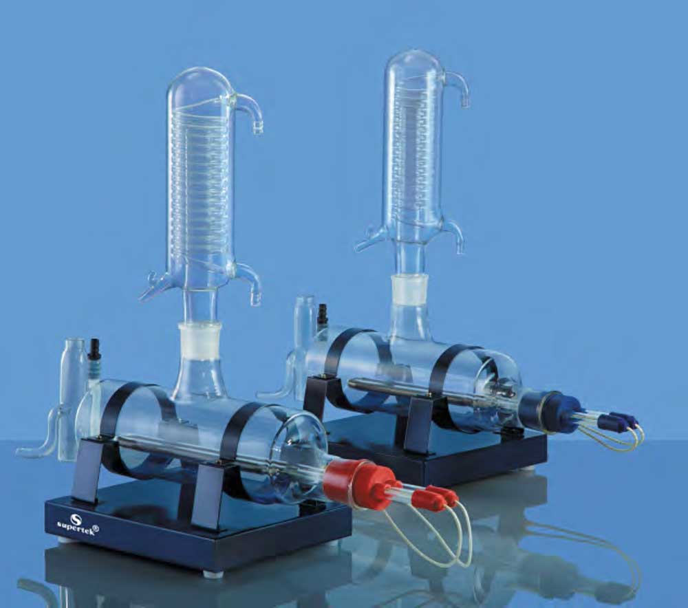 - These distillation units are designed to produce a distillate of consistent purity. The unit consists of horizontal borosilicate boilers, condensers, and quartz heater. All parts are replaceable.