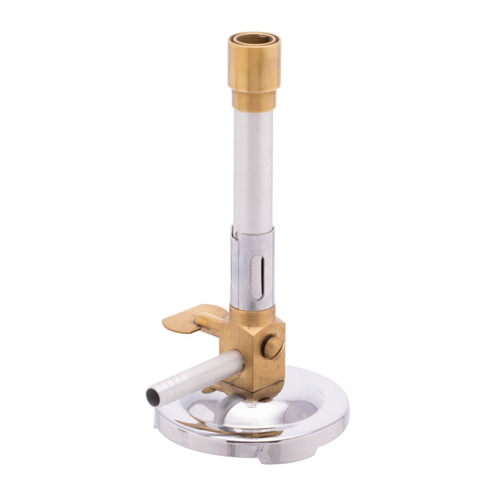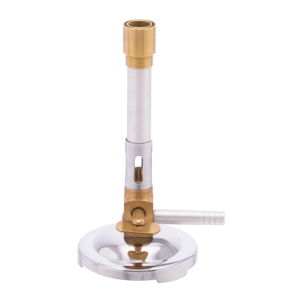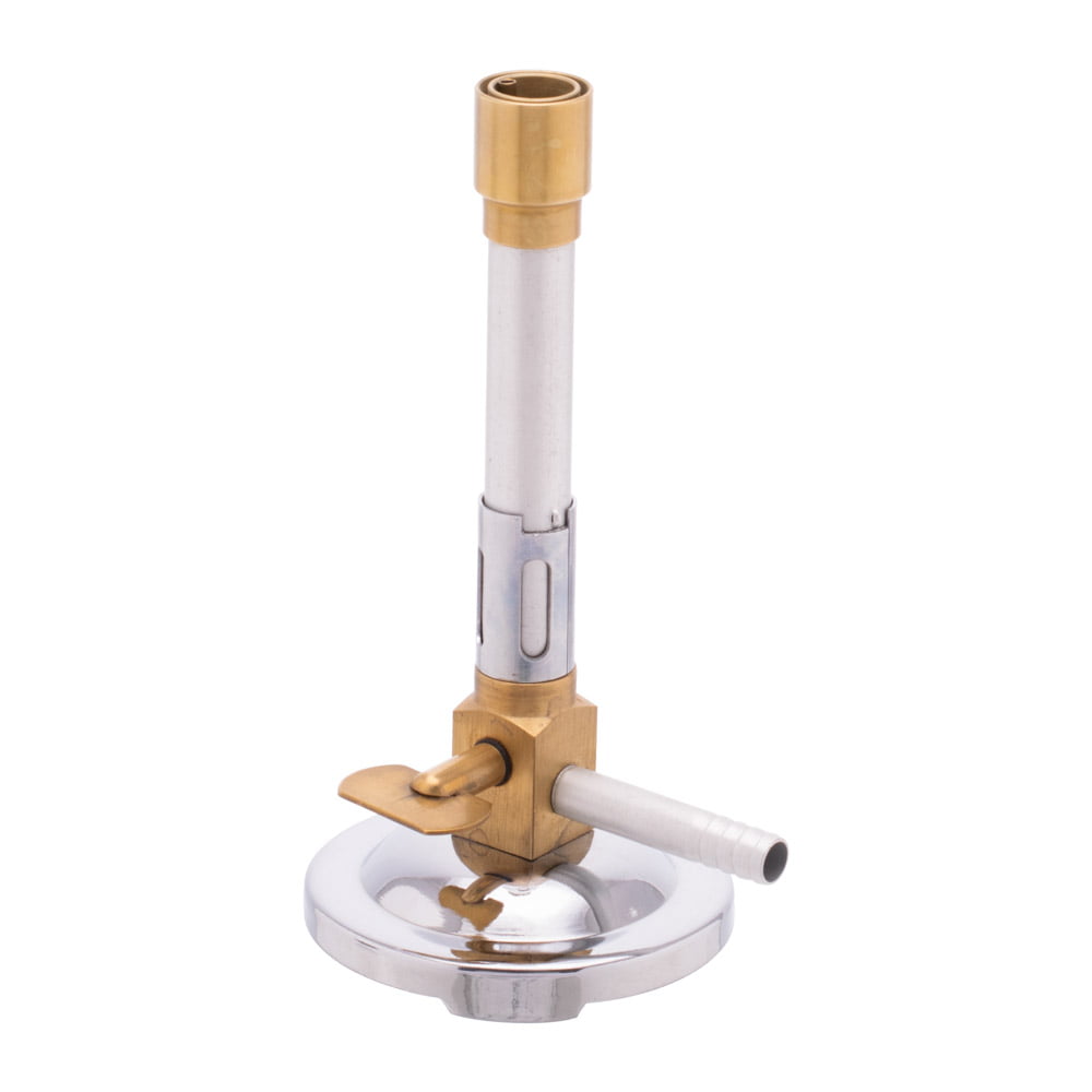 With pilot flame, saves time when the burner is only needed on an intermittent basis. Base is stamped steel with chrome plating. Sleeve- type regulator and stopcock for reliable gas control. Pilot light tube has a screw adjustment for flame control.
