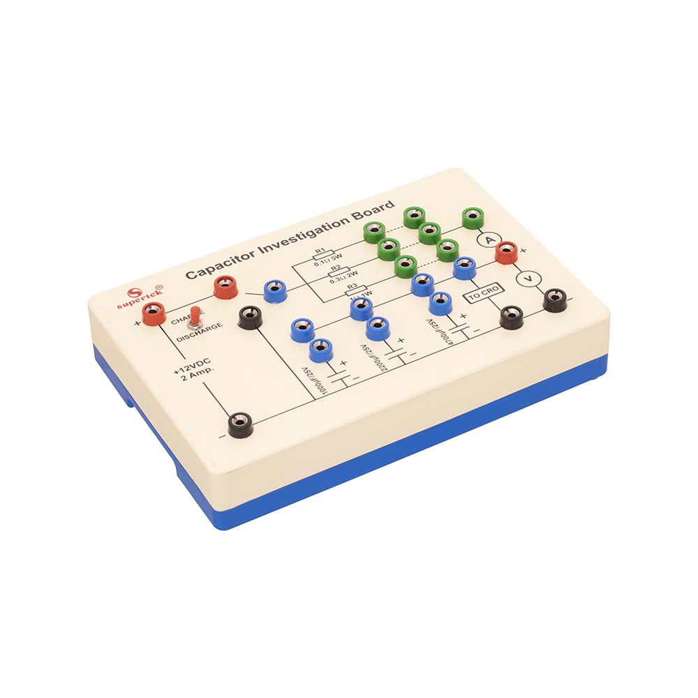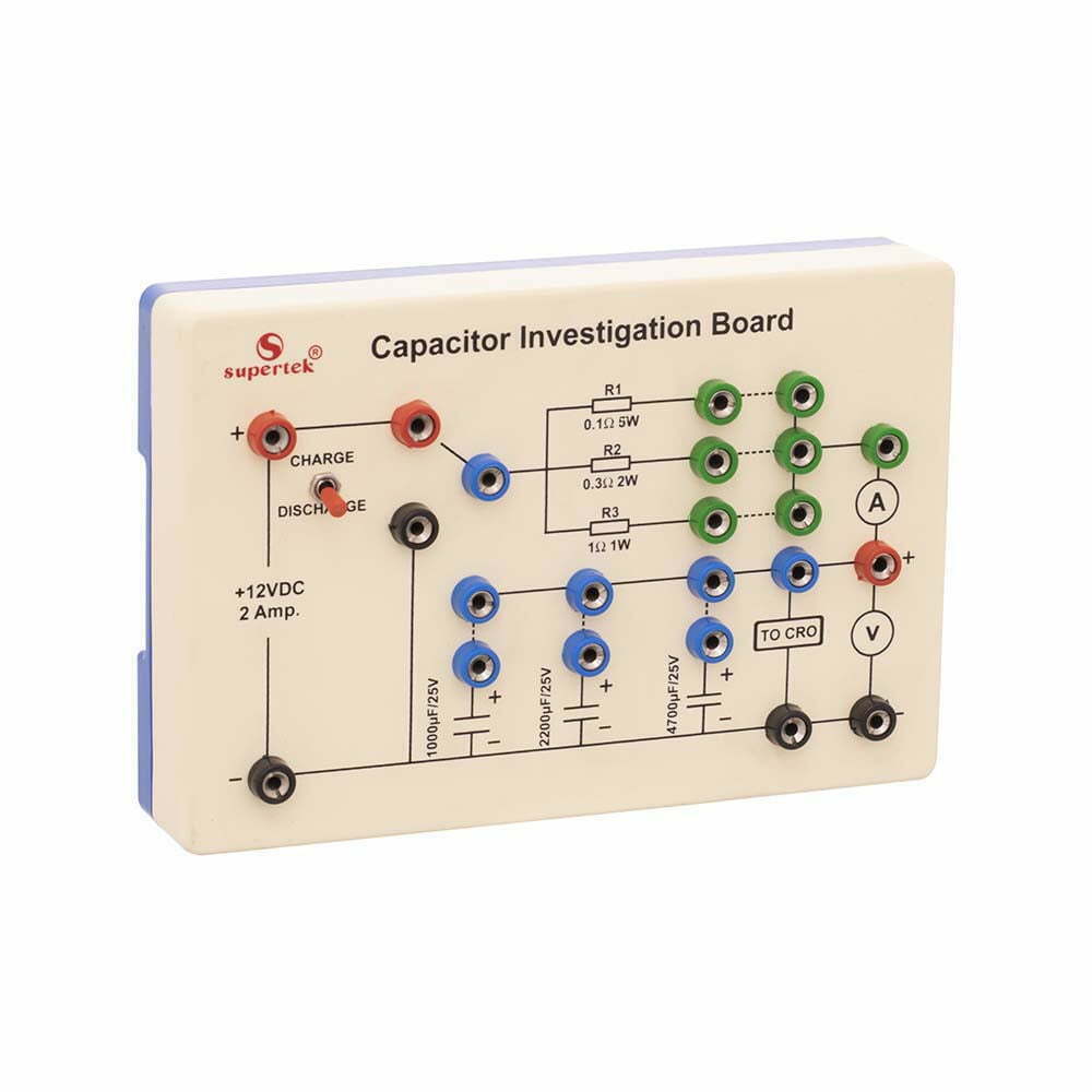 Capacitor Investigation Board is an excellent kit used for study of the charging and discharging of the capacitors. A toggle switch is used to change the charging and discharging mode of capacitor, external + 12V DC 2Amp supply is used for charging the capacitors through the current limiting resistors. The charging of the capacitor can be viewed on CRO. Once the capacitor is fully charged, it can be discharged by turning the toggle switch towards discharge. The discharging of the capacitor can also be viewed on CRO. These experiments can also be performed using the ammeter and voltmeter. Three different combinations of C&R are provided for observing different waveforms.