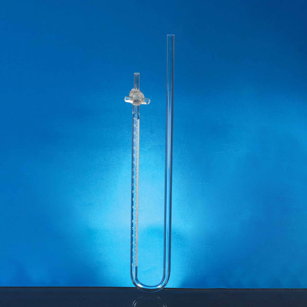 A glass U-tube of 10 mm diameter the shorter limb of which has a stopcock near top and the longer limb can take a plastic tube. A scale is provided and can be attached to the shorter limb. With red indicator oil but without 2000 ml tall form beaker which acts as a reservoir.