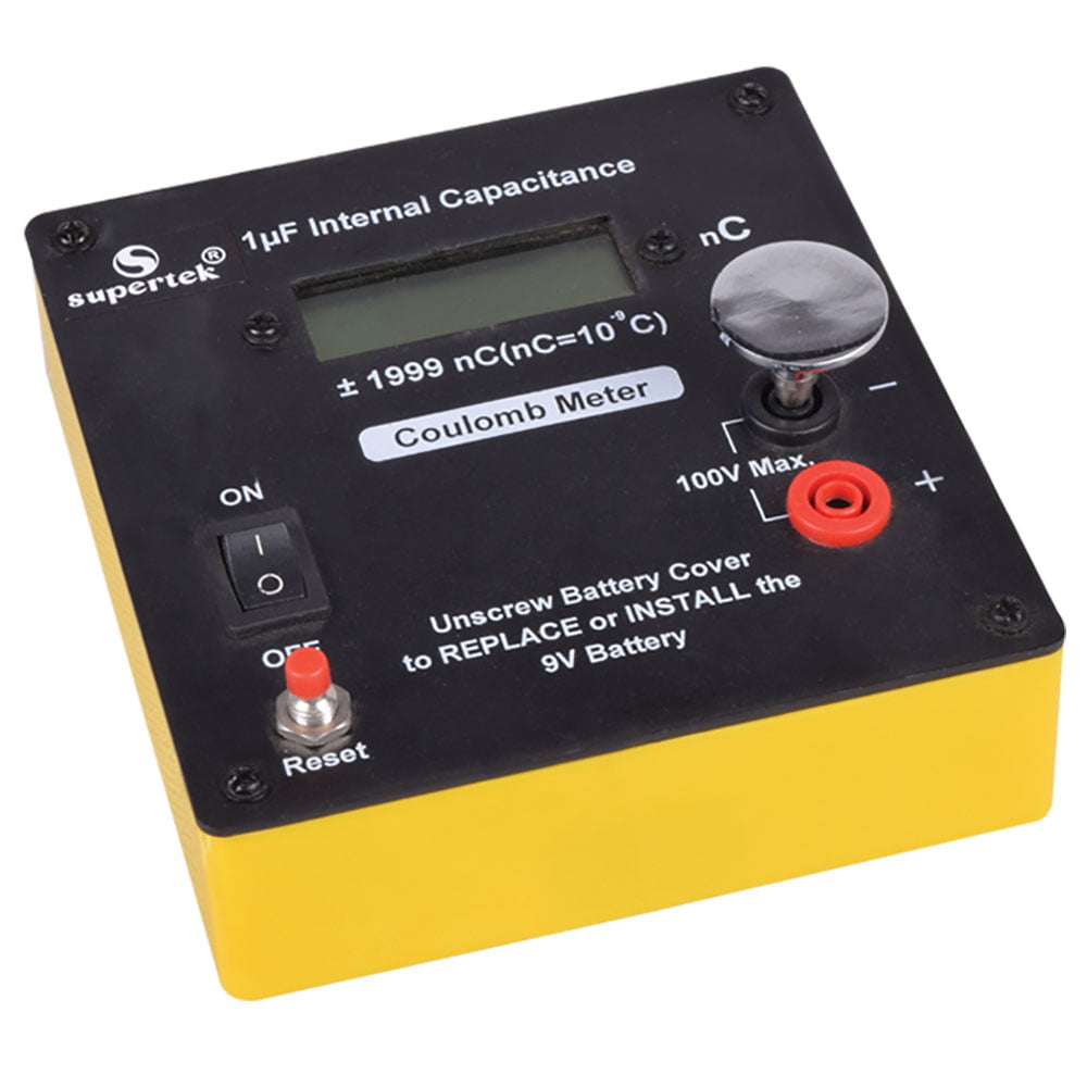 Coulomb Meter is designed to use as a digital electroscope. The LCD display will show the number of coulombs deposited into the instrument either by source of static electricity (a charged plastic rod) current through a resistance or from a capacitor. This instrument shows the charge digitally in Coulombs up to 1999 nC. Accuracy ±10 nC.