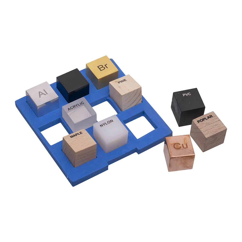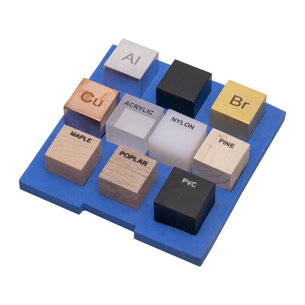 A set of 10, one-inch density cubes in a storage box. Materials included are Acrylic, Aluminium, Brass, Copper, Maple, Nylon, Pine, Poplar, PVC, and Steel.