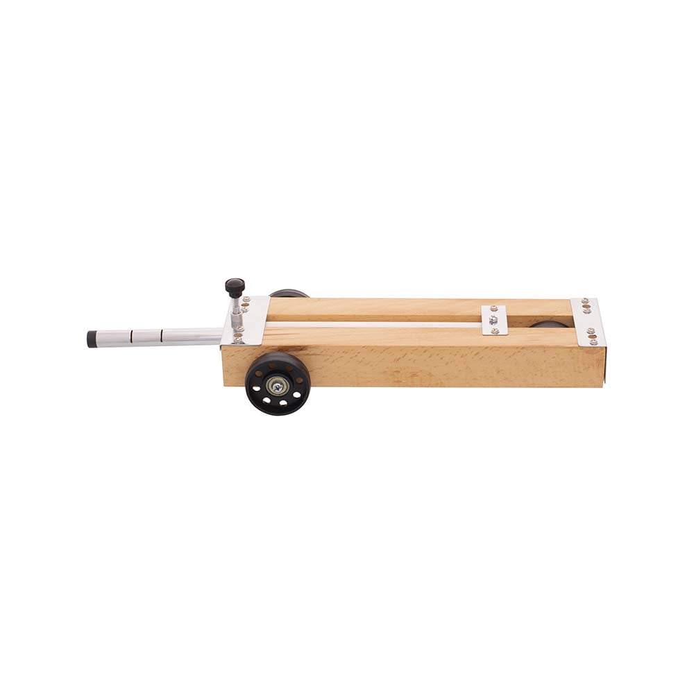 Hardwood, 300 mm long, metal reinforced ends, three low friction ball bearing wheels, quick release triple impulse spring, 4 removable metal legs to enable stacking of trolleys, mass 0.9 kg approx.