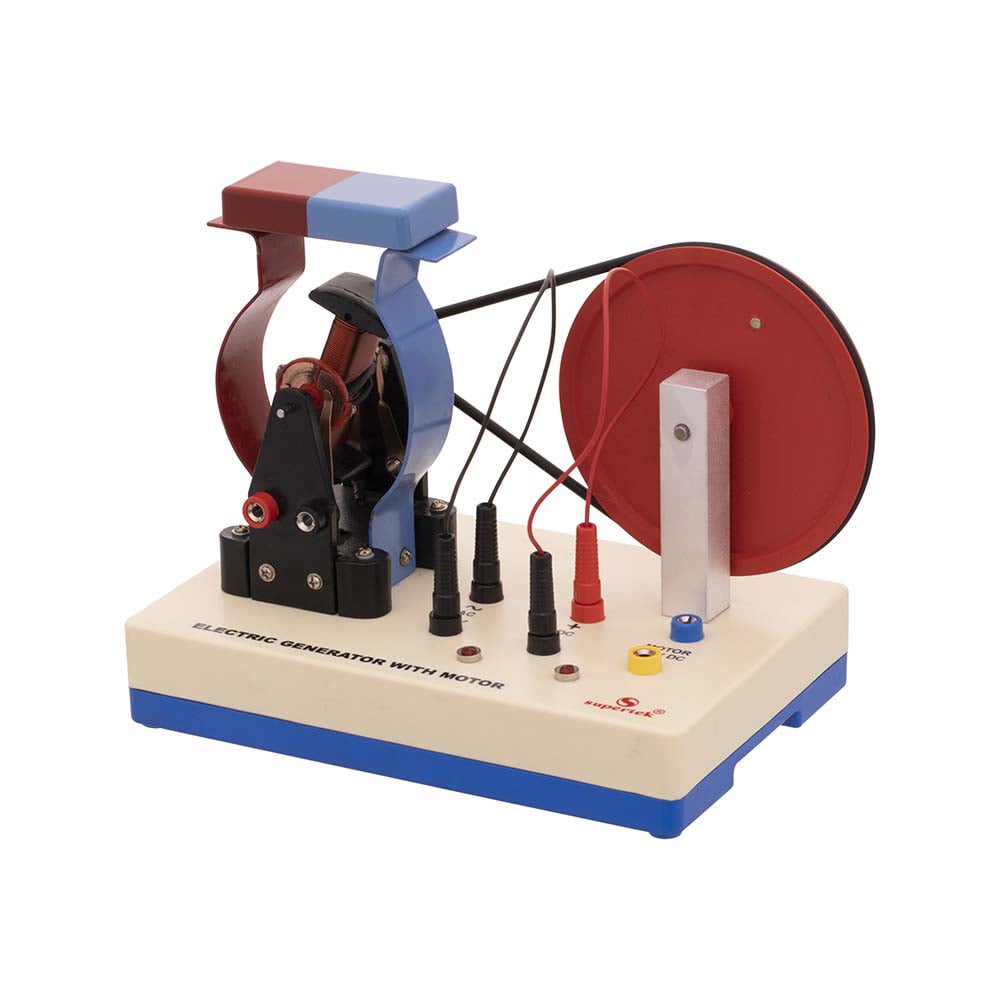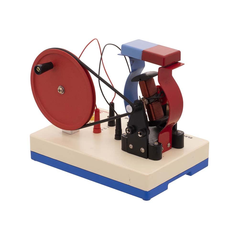 Dynamo model for generating electrical current using a commutator. The setup includes driving wheel (with one spare belt) mounted on plastic base. LED is also provided as a simple output indicator.
