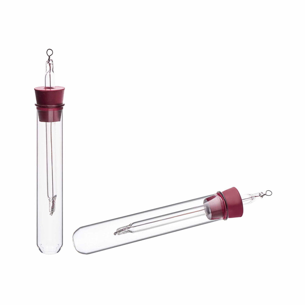 Platinum wire or foil fused into glass rod with internal lead, with rubber stopper and glass protection tube, per pair.