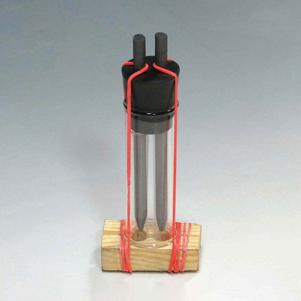 Open-ended glass tube, 75 x 25 mm fitted with 2 carbon electrodes through a rubber cork, separated by a plastic sheet, complete with two collecting tubes of size 75 x 10 mm.
