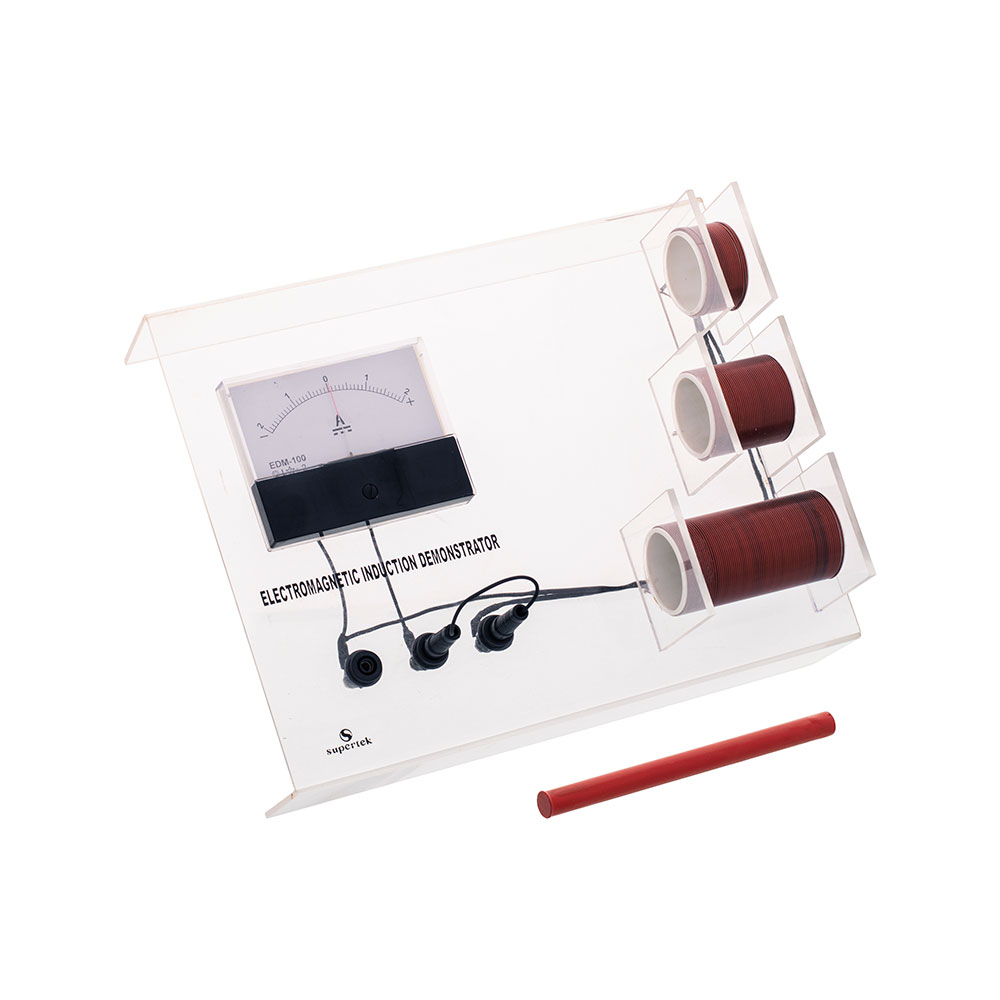 Electromagnetic Induction Demonstrator kit is used for demonstrating the important experiments performed by Faraday and how they lead to some of the significant conclusions in electromagnetism. It is designed to perform studies even beyond the basic experiments. It comprises of three solenoids of 20, 40 and 80 turns, each of identical cross-sections, mounted on a transparent base along with a milliammeter. These three coils of different lengths are provided to understand the effect of length of coil on induced current. Repeatedly inserting a magnet into the coil and removing it causes electric current to flow through the coil, which can be read directly from the milliammeter. Also notice that the milliammeter shows zero current when the magnet is not moving. Using this apparatus, students can study correlations between induced current to that of magnetic field strength, number of turns of coil, magnetic field polarity and speed. Requires 1.5V dry cell battery (not included).