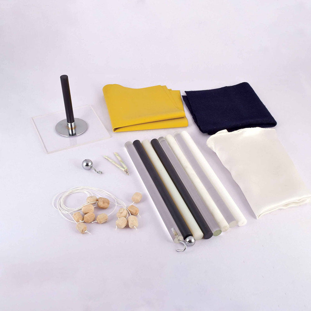 This is a basic kit for the study of electricity. For the generation of electricity by friction and to store and transfer electricity. Includes electrophorus, 6 different friction rods, acetate cloth, woolen cloth, silk cloth, proof plane, neon lamp, a conductive ball with hook, an acrylic rod with hook & 12 pith balls. With the instruction manual.
