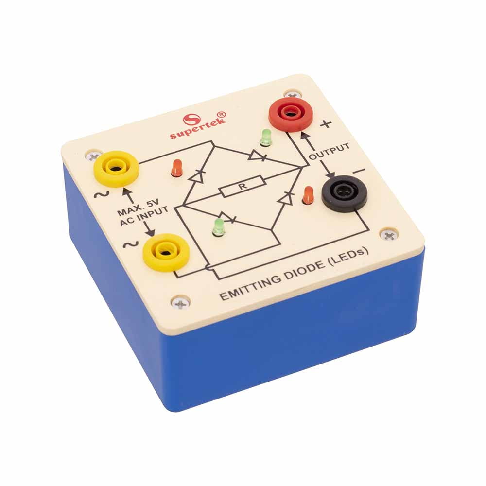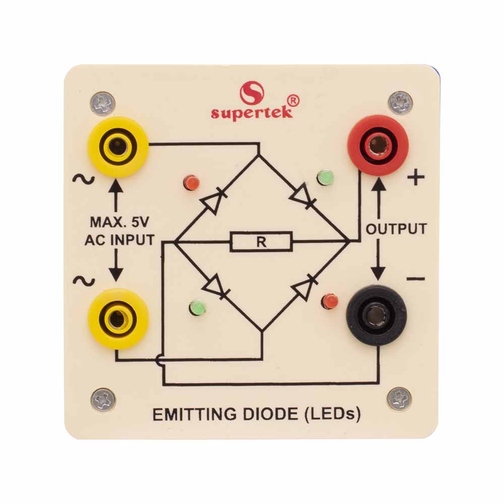 The bridge rectifier is designed with four LED’s internally arranged in a bridge pattern fitted inside a plastic moulded case. Two LED’s are red and two LED’s are green. This device is used to demonstrate the functioning of a bridge rectifier, i.e., to convert alternating current (AC) into direct current (DC). Two yellow sockets are used for AC input. Two sockets, one red, and one black are used for DC output. For the easy understanding of the internal circuitry, the circuit diagram is printed on the box.