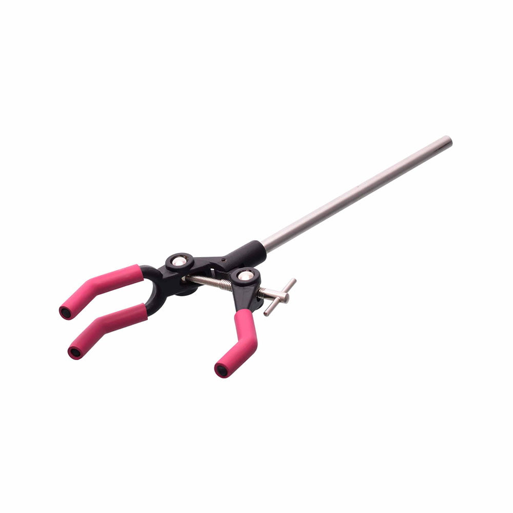 Three-prong, aluminum extension clamp; prongs covered with rubber tubing. Overall length: 10″. Jaws open to 85 mm. Rod Dia. 8 mm, Rod length 145 mm.
