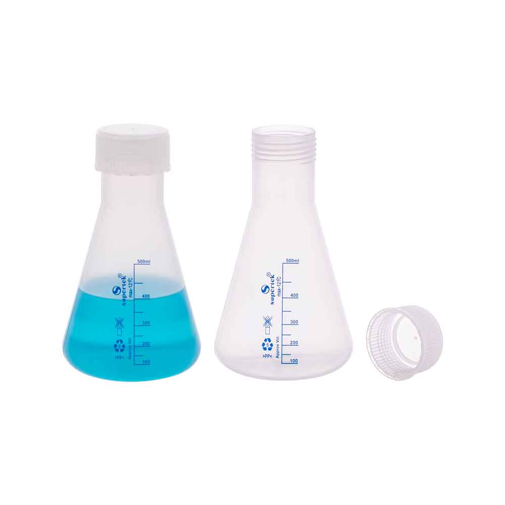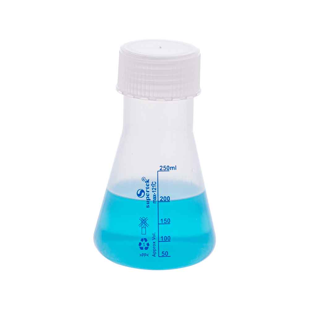 These cone shaped flasks are rigid, translucent and autoclavable. The screw cap keeps the contents of the flask contamination free and makes the flask leakproof. Threads should be disengaged before autoclaving.