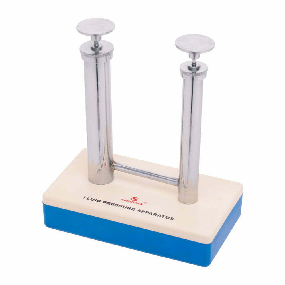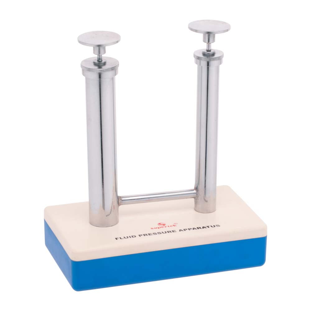 Comprises two brass cylinders of different diameters fitted with pistons and connected by a brass tube. Mounted on plastic base.