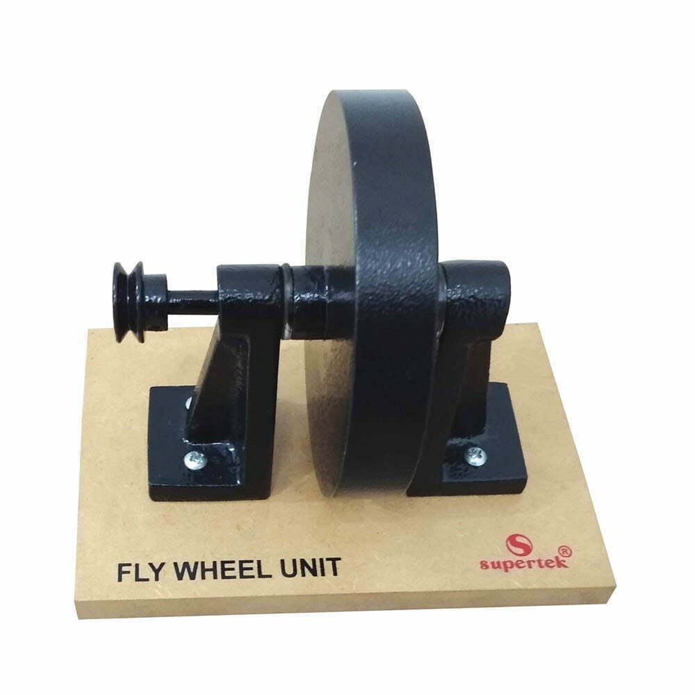 Steel fly wheel 100 mm diam. with pulley 20 mm dia. on shaft held in brackets, mounted on base.
