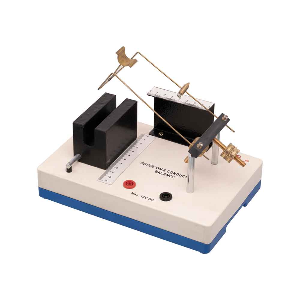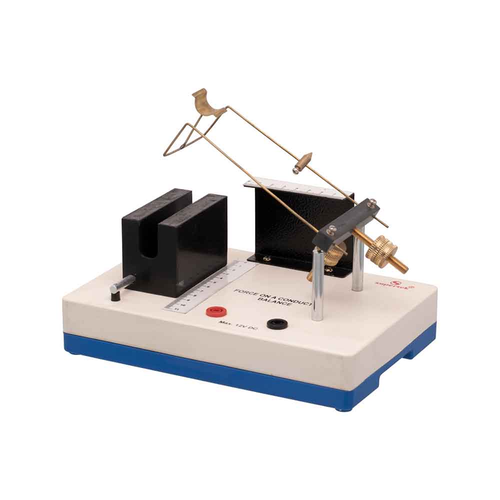 To demonstrate that when a current is passed through a conductor in a magnetic field, it is subjected to attraction or repulsion depending upon the direction of current in it. The apparatus consists of a plastic base 9″ x 6″ x 1″ on which two contact pillars are mounted. Each pillar is provided with an external circuit. A balanced beam is supported by the pillars on two bearings which form the fulcrum. Two screwed masses are provided in the beam system, one moving vertically for the adjustment of sensitivity and the other moving horizontally for the adjustment of the equilibrium position, when no current is flowing. Scale is marked 0-80 x 1 mm and rider is of 1 gm. Includes instruction manual.