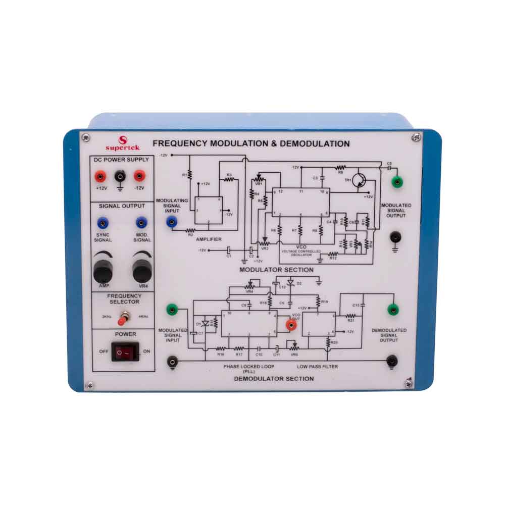 This Instrument is designed to demonstrate the method to transmit signals via. Electromagnetic transmission and to study Frequency Modulation and Demodulation. The whole instrument is placed in the plastic moulded box and 2 mm banana plug leads are provided for modulation and demodulation connections.