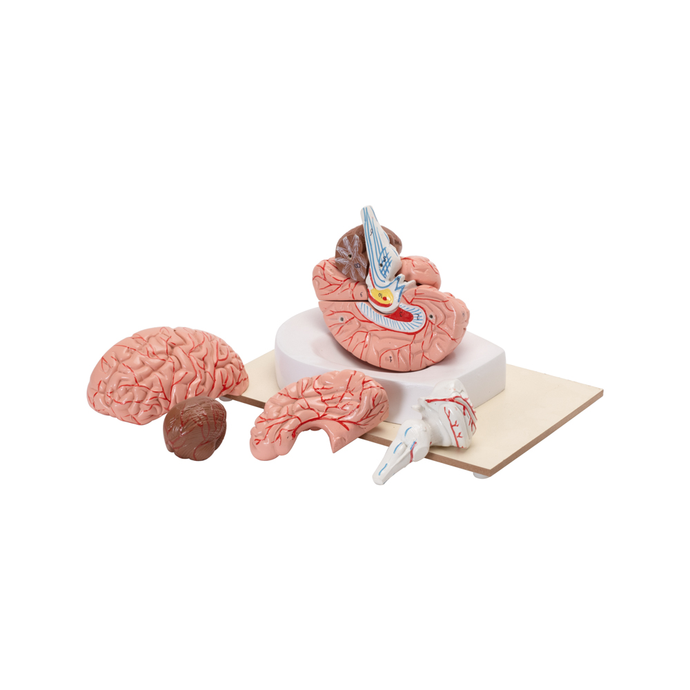 overall structure, arterial supply, and relationships between different components of the brain. The model accurately represents external features with magnetic parts, including the cerebral hemispheres, brain stem, and cerebellum. Life-sized and dissected into eight parts, this model provides a detailed examination of the intricate structures of the brain.