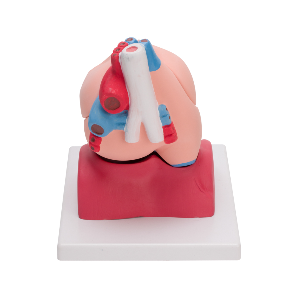 The heart is cut into 2 parts by a vertical line towards the level of the ventricular septum and separates into 2 parts after the arch of aorta and superior venacava have been removed. Both auricles and ventricles with the bicuspid and tricuspid semilunar valves as well as the sigmoid valves can be seen. Separates in 4 parts.