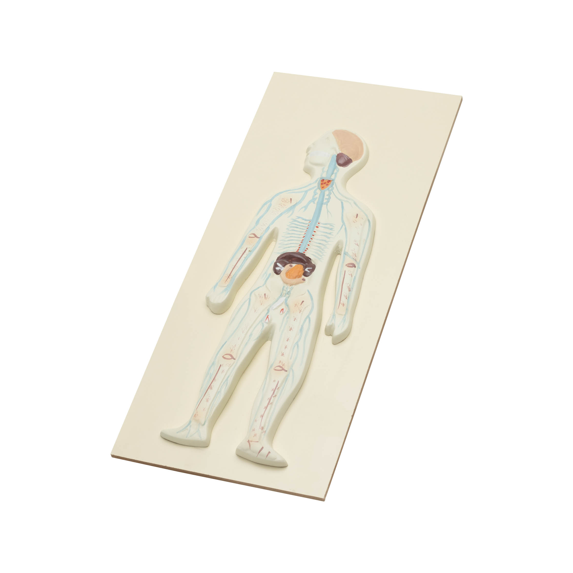 This compact anatomical model provides a detailed representation of the human nervous system, including the brain, spinal cord, and nerves in their natural positions within the body. Despite its smaller size, the model accurately depicts the intricate structures and connections of the nervous system. Mounted on a board for stability and ease of display, it offers a comprehensive view of neuroanatomy that is perfect for smaller space sopor table educational settings. The model comes with a key card that labels and explains each component, making it an excellent tool for students, educators, and medical professionals to study and understand the human nervous system.