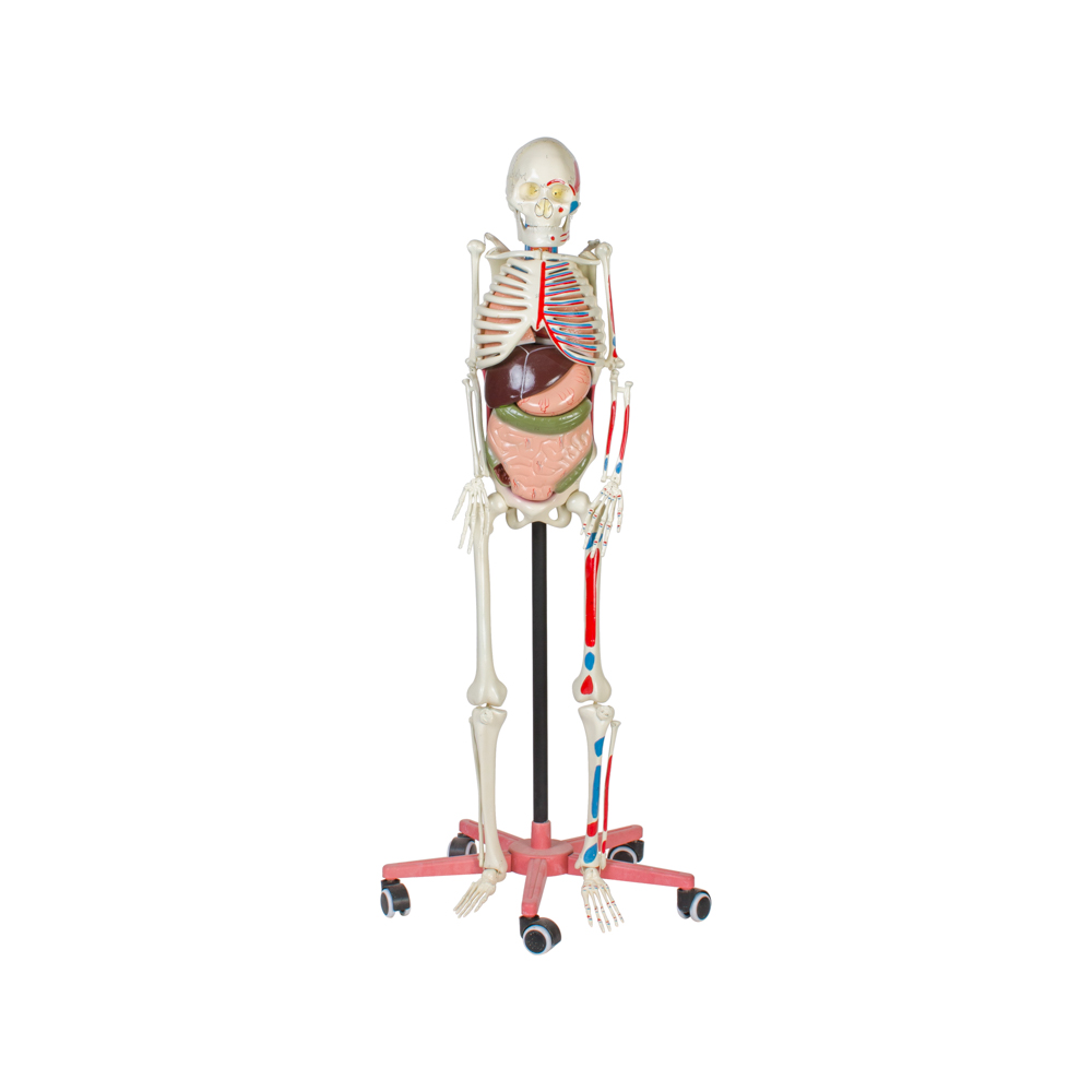 This life-sized human skeleton model is designed for comprehensive demonstrations, featuring hand-painted muscle origins and flexible joints. The skull includes a movable jaw, and the model incorporates detachable parts such as a two-part heart, right lung, left lung, liver, stomach, small intestine, and large intestine. Both arms and legs are movable, allowing for dynamic presentations. The model is securely mounted on a plastic stand and includes a key card for detailed reference.
