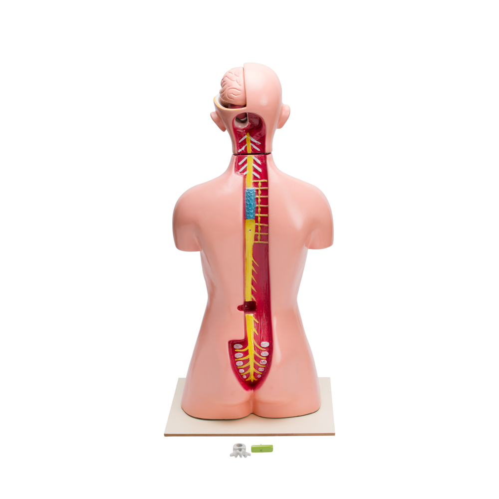 This life-sized, sexless torso model consists of 12 parts, allowing for a comprehensive study of human anatomy. The model features removable components, including the eye and half brain for detailed examination. Additionally, two lungs, halves of the heart in two parts, a removable liver, stomach, and intestine provide an in-depth understanding of internal structures. The back of the model showcases the vertebral column with removable vertebrae and spinal cord. Mounted on a durable plastic base, the model is accompanied by a key card for easy reference.