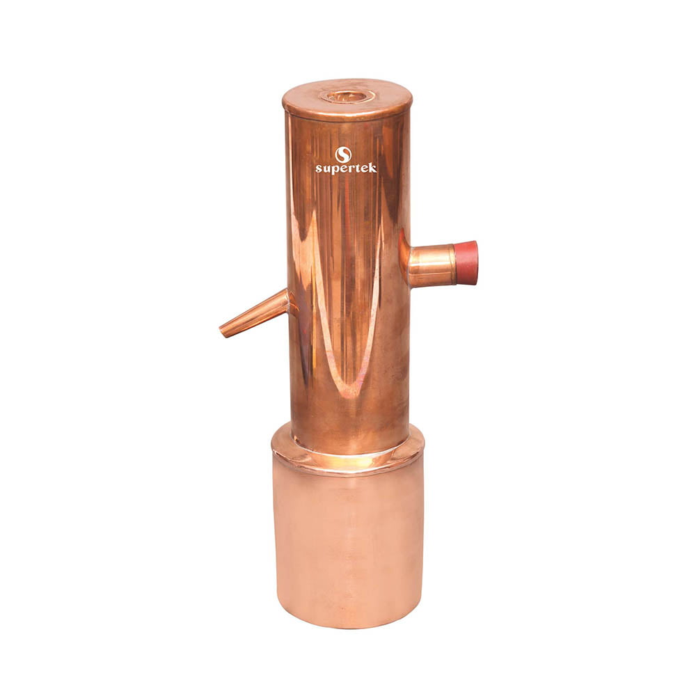Double-walled copper cylinder, 340 x 60 mm, mounted on steam boiler, with thermometer tubule at top and side outlets for manometer and draining.