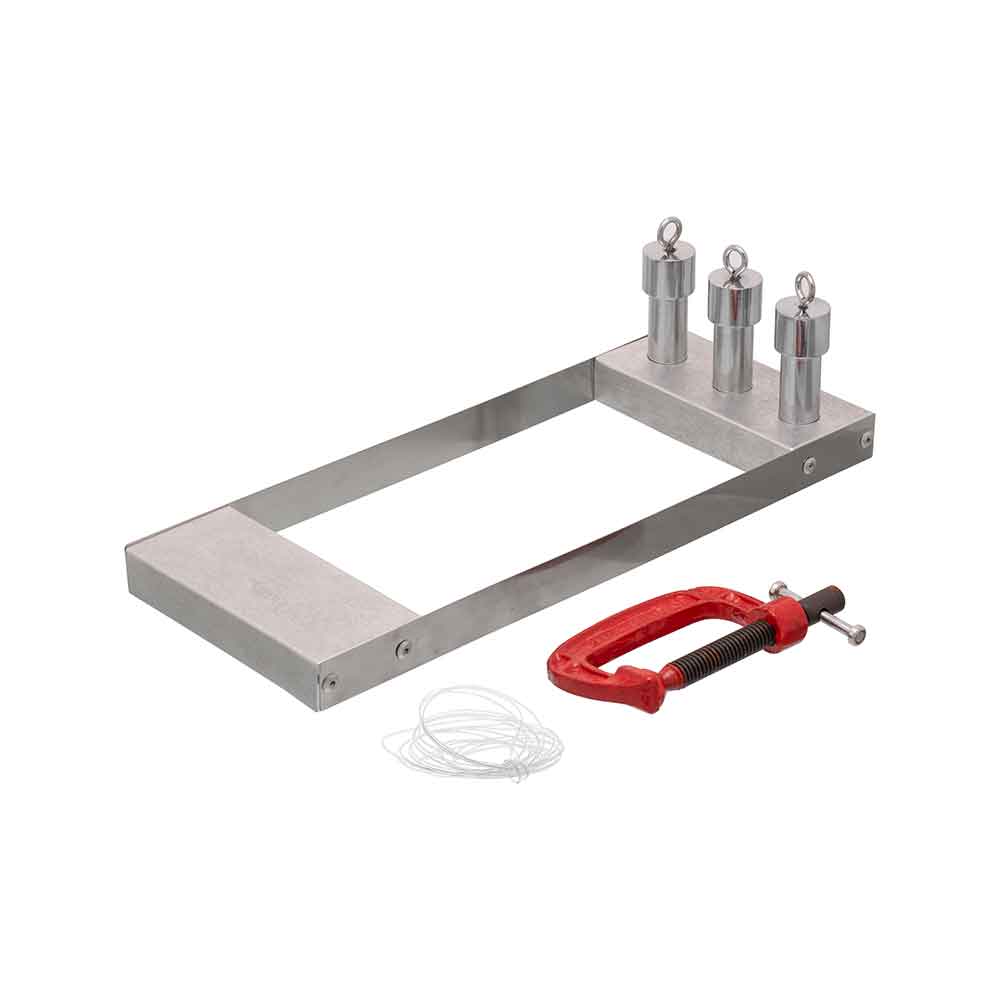 For investigating the nature of mass and the distinction between mass and weight. Two metal trays 130 x 55 x 23 mm are joined together with two spring steel strips of 23 mm width, the distance between the trays being 215 mm. One tray is drilled to accept 3 equal cylindrical masses. The other tray can be clamped to a bench horizontally or vertically. Complete with 3 masses and a ‘G’ clamp.