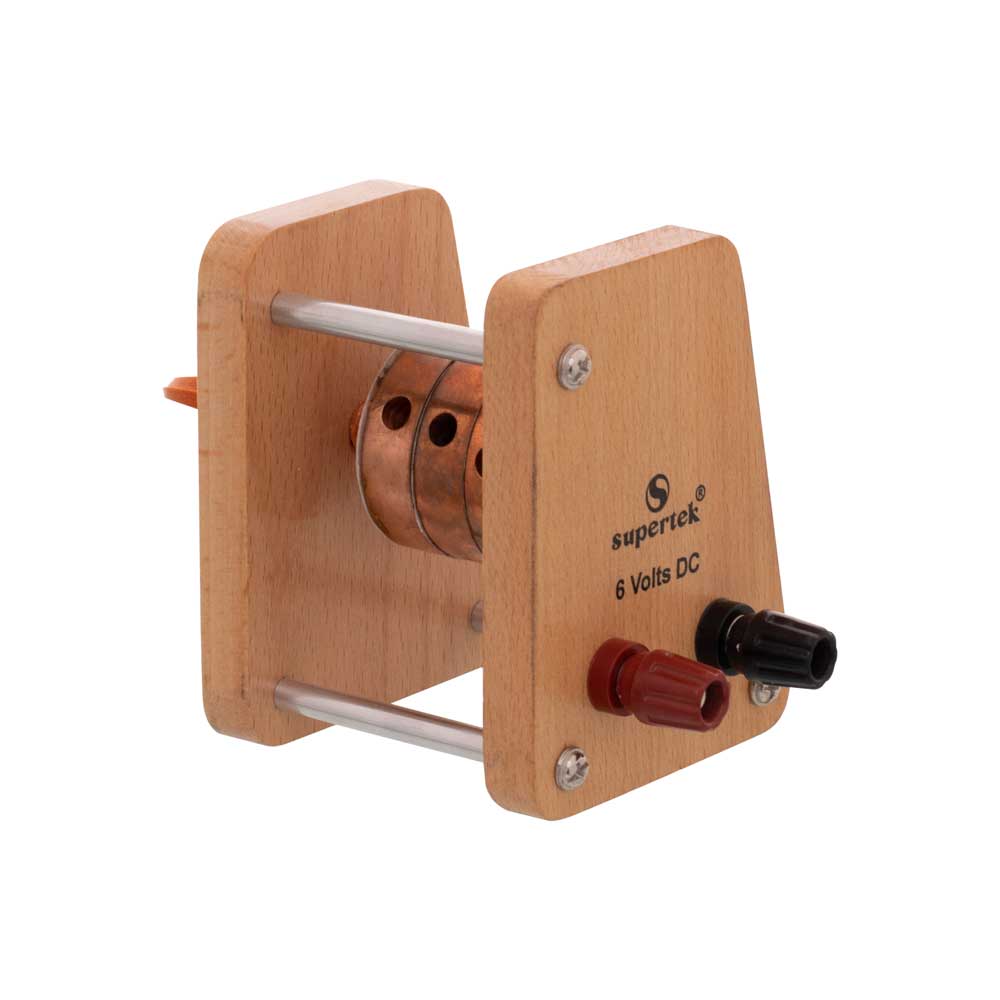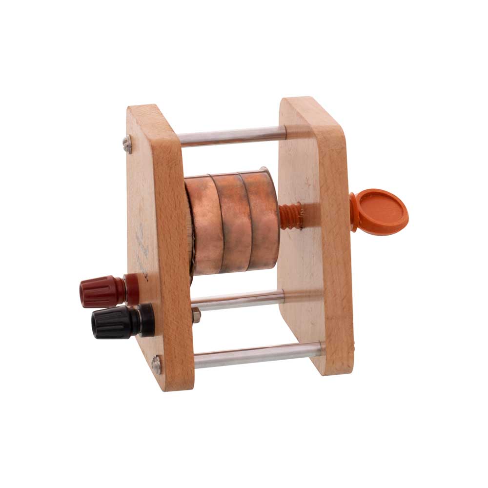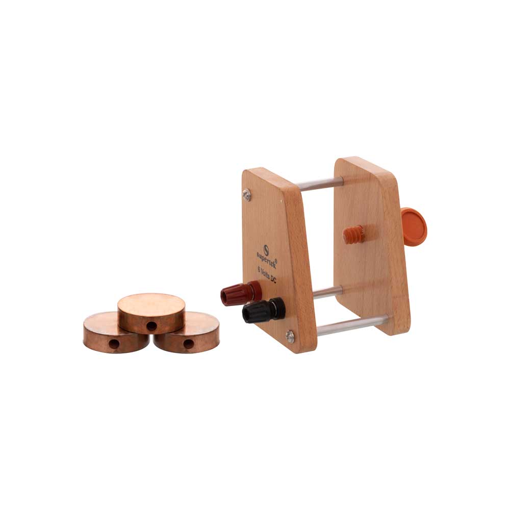For poor conductors, 3 cylindrical blocks of Copper 50 mm diameter 12.5 mm thick, with radial holes for thermometers, are clamped in a wooden frame by a screw, with 2.5 W, 6 V heating element and a set of 3 bad conductor discs.