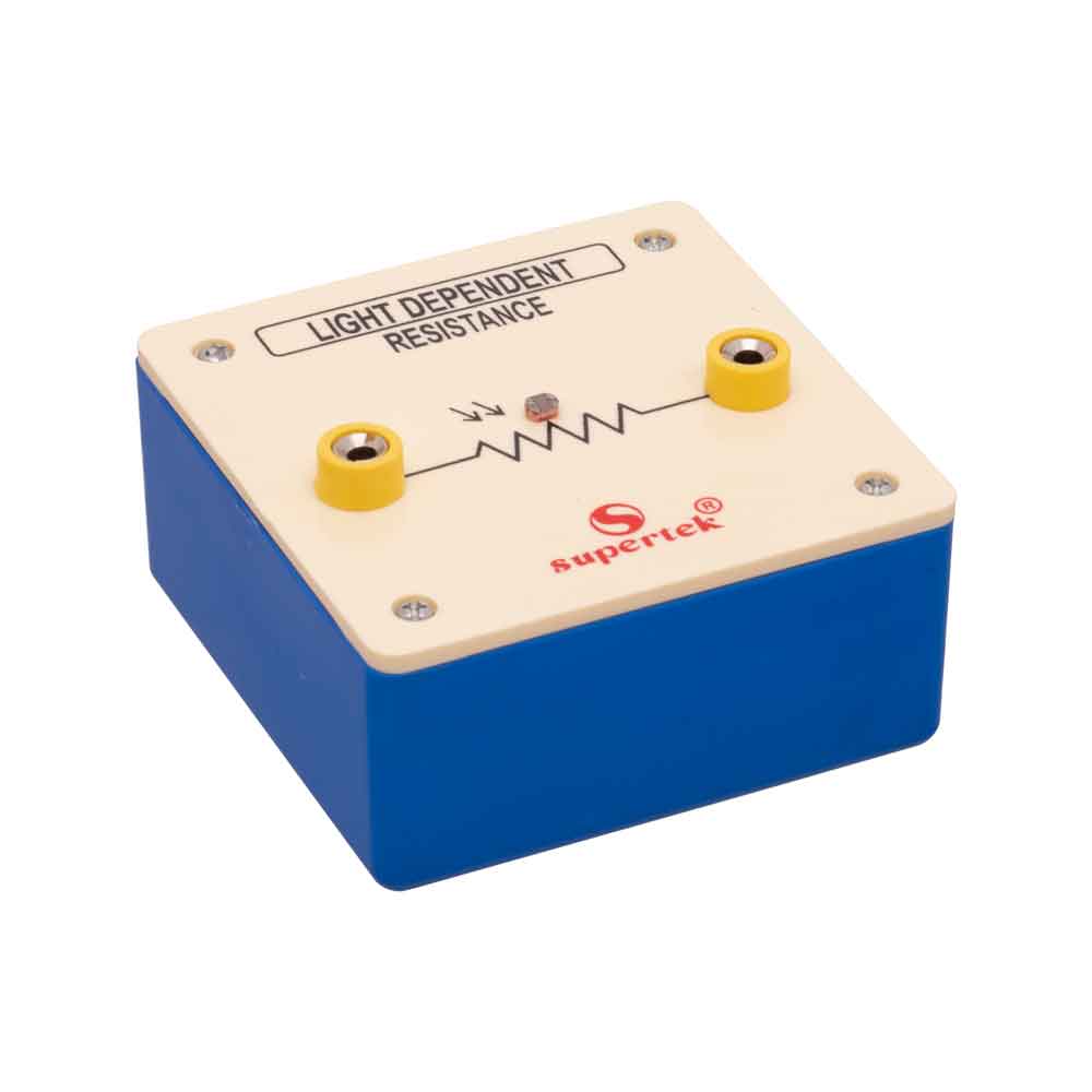 Mounted on base, with 4 mm color-coded sockets, with circuit diagram printed for demonstration. Shows that resistance is inversely proportional to light density.