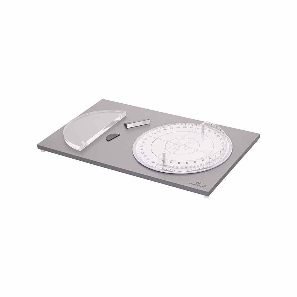 This optical kit helps students study the important wave properties- Reflection and Refraction. The kit consists of a wooden base and rotating platform. The rotating platform provides a high degree of accuracy when making angular measurements as well as easy rotation without disturbing the light source. The kit also includes one semicircular acrylic lens, one semicircular transparent tank, one mirror with support and one small metal protractor. Light source is not included.