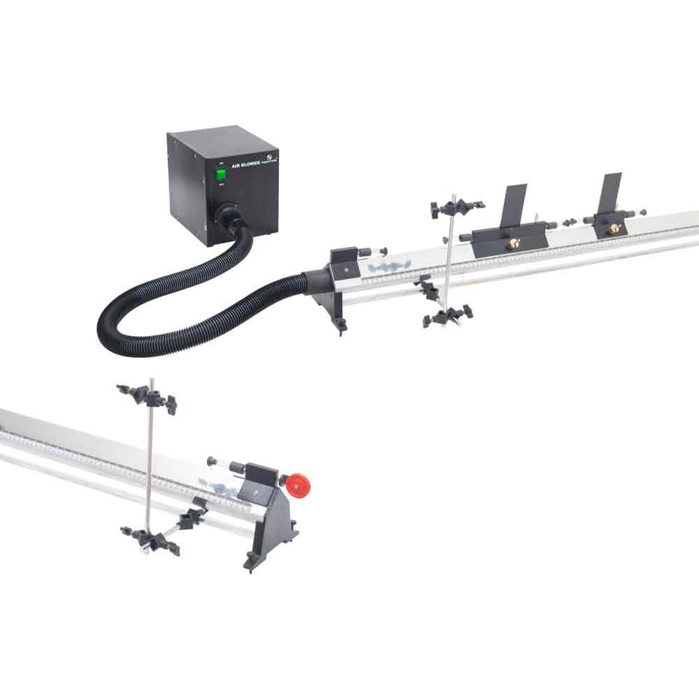 Square section aluminium alloy track, length 1.5 m, with staggered holes, supported on two light alloy castings. One support has a two-point contact and other one-point contact for lateral and horizontal adjustments by means of a knurled screw. Identical end caps enable air to be introduced from either end of the track keeping the other end closed.