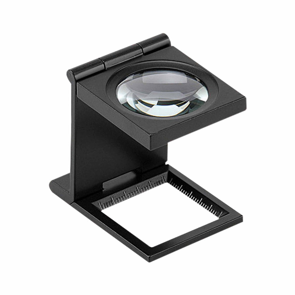 These are collapsible pocket magnifiers. The optical system is a single-element, glass Double Convex Lens. The housing is made of machined, black high-grade plastic for a polished look. These magnifiers fold flat to fit in your pocket. Scales are etched on the inner faces of the viewer’s base.