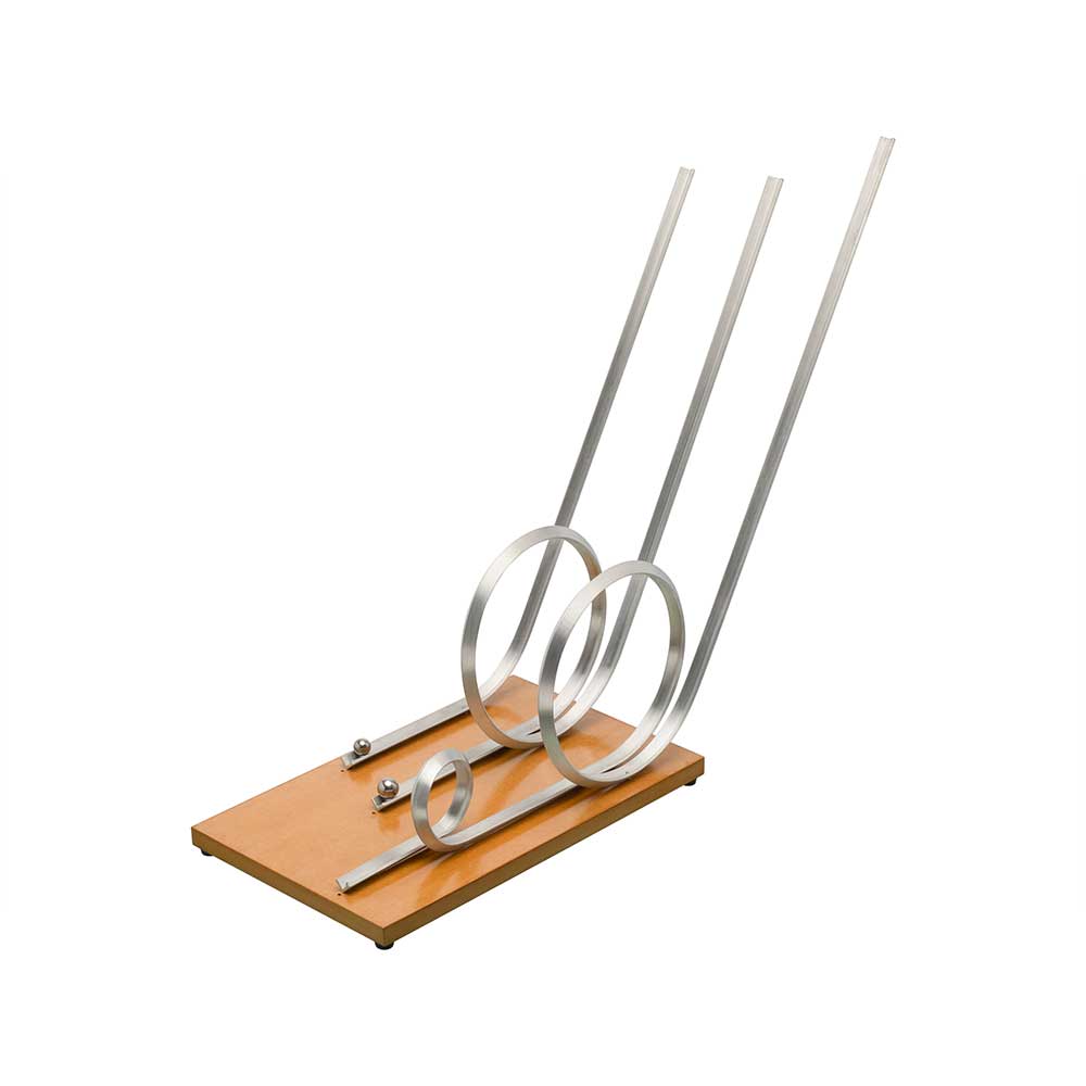 Understanding the principles of physics that occur on a roller coaster has become easier. This triple play apparatus consists of three tracks – one straight down, one with one loop, and the third with two loops. All three have different straight-up track lengths. At the end of each track is a catch sack to prevent losing the ball.