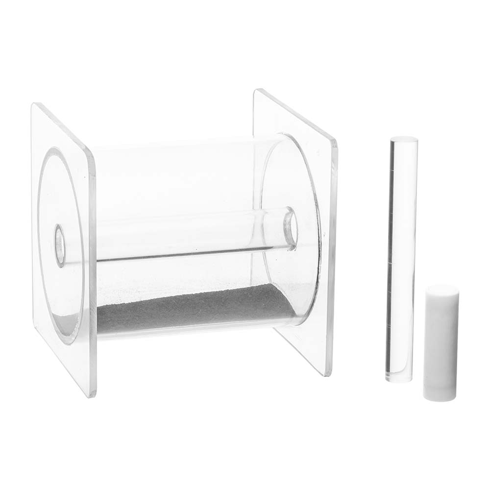 Transparent acrylic chamber contains iron filings. Chamber also has an internal tunnel into which bar magnet can be inserted to demonstrate magnetic field pattern. Other shaped magnets can be investigated by positioning their poles near one side of chamber. With Cylindrical magnet.