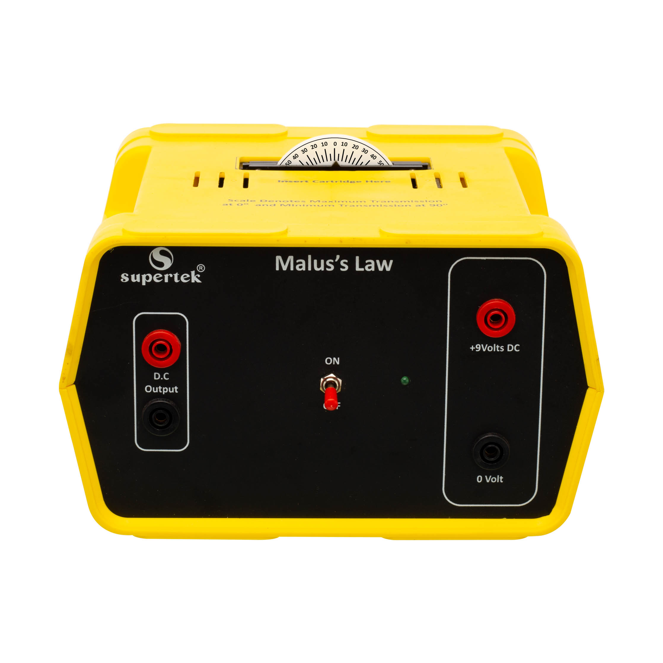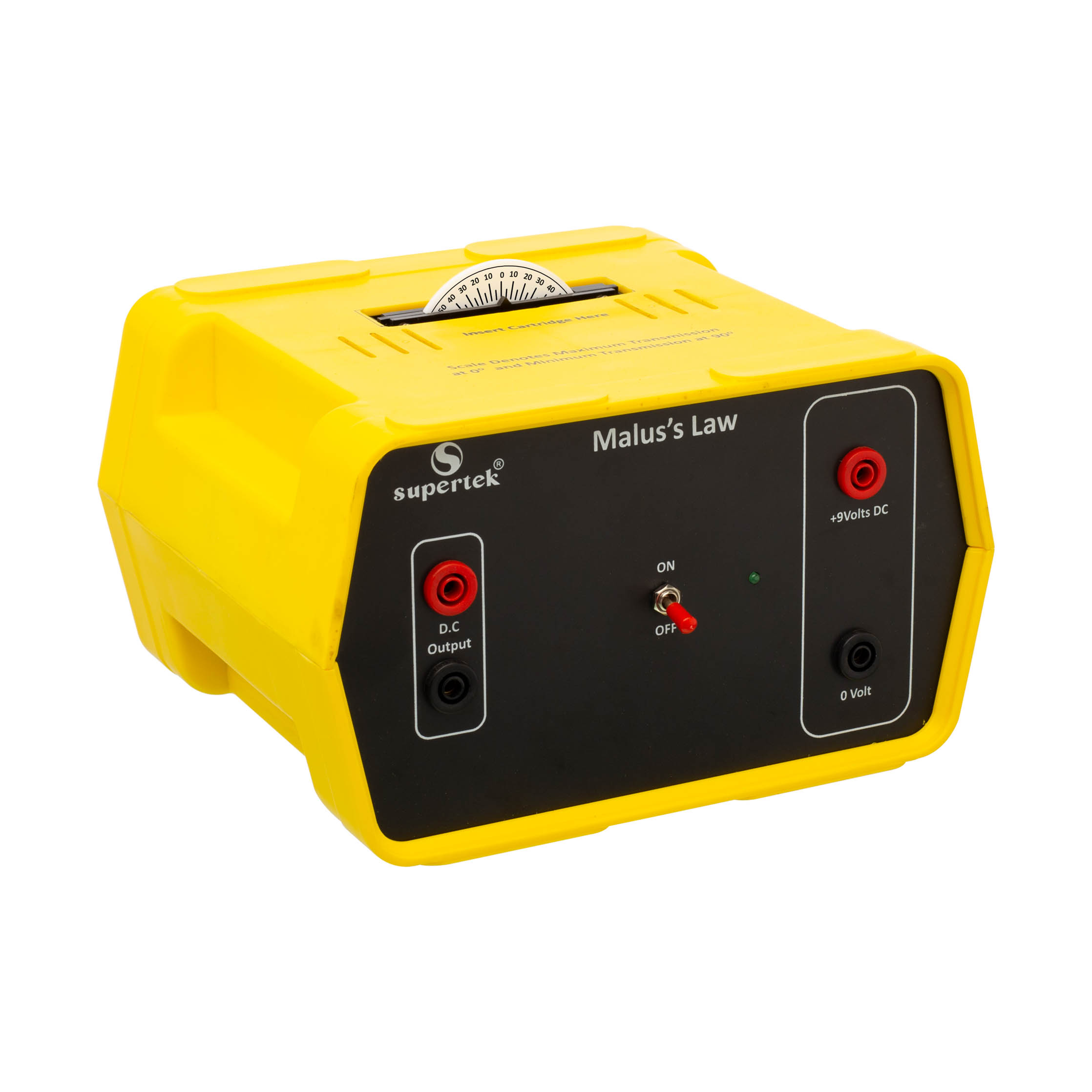 Students can investigate the relationship between the intensity of transmitted light and the angle of rotation of two polarizing filters. A graduated cartridge containing two polarizing filters allows students to observe the change in intensity as they are rotated relative to one another. The analyzer allows quantitative readings to be taken using a voltmeter at five-degree intervals as the polarizing filters are rotated from minimum to maximum transmission. The output from the analyzer changes linearly with light intensity and so the resulting data can be used to verify Malus’ Law. Includes instructions.
