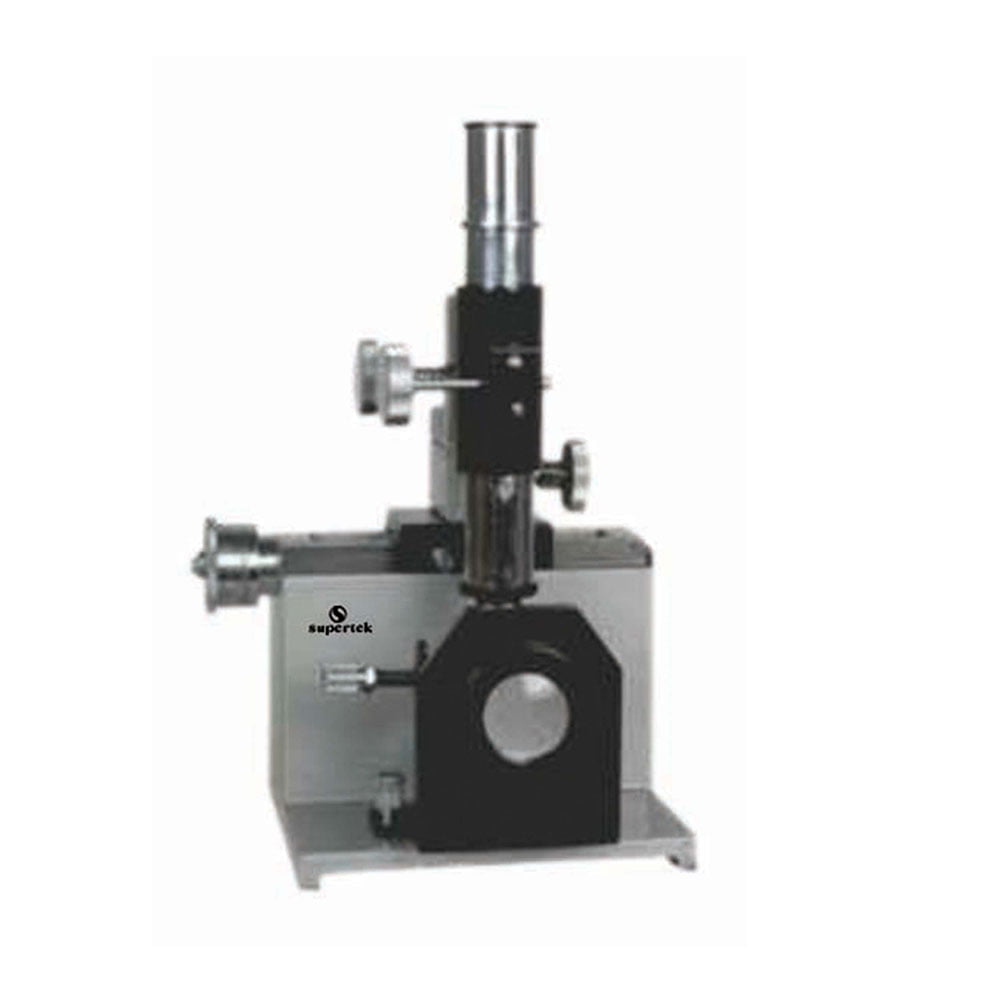 For Newton Ring Apparatus. Can also be used in various positions, heavy cast iron body, microscope tube mounted on a carriage sliding on top of the base, provided with fine adjustment screw, scale 120 mm long, vernier reading to 0.01 mm fitted with 10x Ramsden eye-piece, glass cross-line graticule and 75 mm focus achromatic objective.