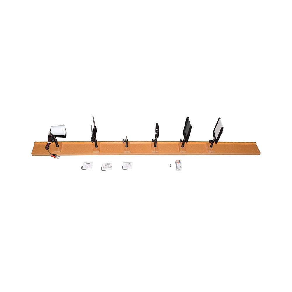 On wooden base, with 1.5-meter scale, with six sliding bases. Each sliding base is with an index mark, a moulded pillar and locking screw, with following accessories: