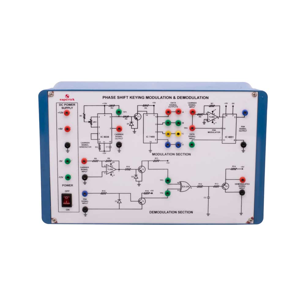 This Instrument is designed to demonstrate the method to transmit signals via. Electromagnetic transmission and to study the Phase Shift Keying Modulation and Demodulation. The whole instrument is placed in the plastic moulded box and 2 mm banana plug leads are provided for modulation and demodulation connections.