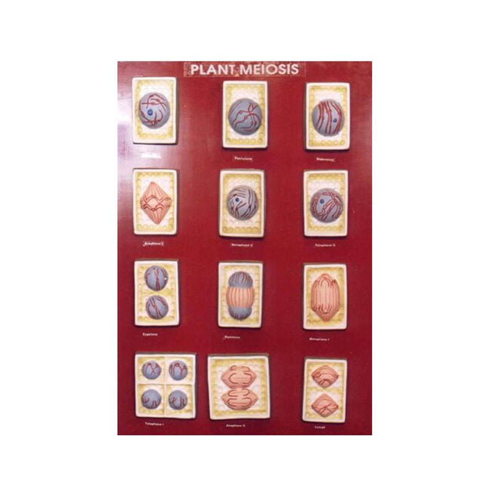 Explore the latest understanding of chromosome changes with this set of 15 newly designed models. From the resting nucleus to the formation of four daughter cells, each phase is depicted and mounted on a board. Phases and details include interphase, prophase-1 (leptotene, zygotene, pachytene, and diplotene), diakinesis, metaphase-1, anaphase-1, telophase-1, daughter cells, prophase-2, metaphase-2, anaphase-2, telophase-2, and gametes.