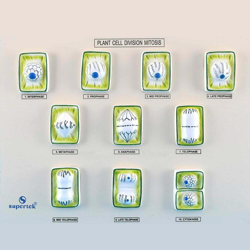 Presenting a set of 10 models illustrating the complete process of karyokinesis and cytokinesis, from the metabolic cell to the formation of two daughter nuclei. Each model identifies the key components of cell phases during mitosis, highlighting changes cells undergo throughout the stages. Featuring detailed representations of the nucleus, centrioles, centrosome, chromatin, chromosomes, spindle, and aster, all stages are mounted on a board for easy display and accompanied by a key card for reference.