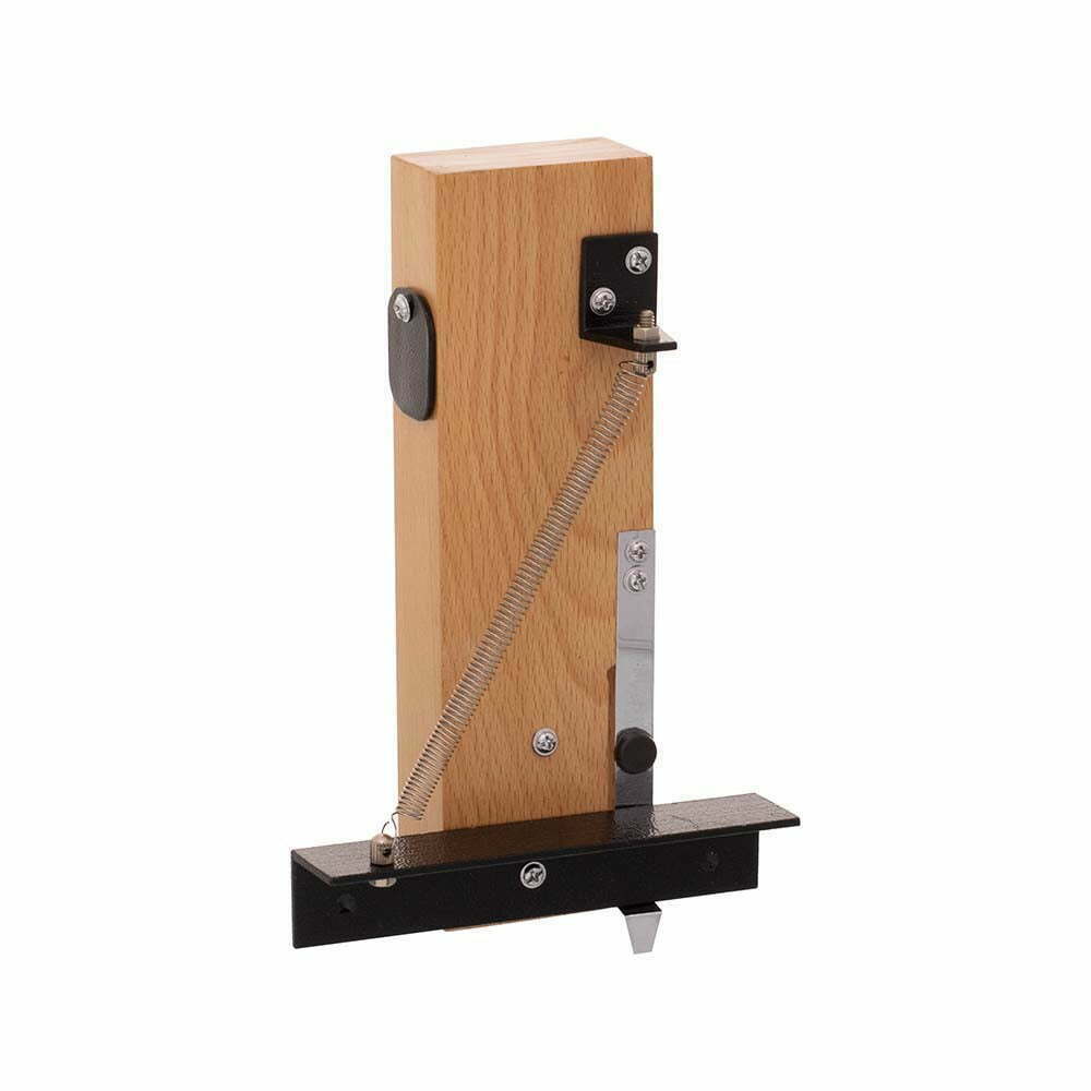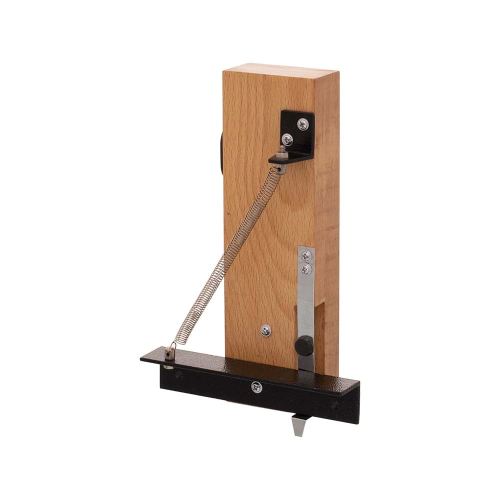 (Falling Body Apparatus) Showing that horizontal and vertical motions are independent of each other. Consists of a wooden block 190 x 58 x 30 mm approx. with a pivoted L-section spring loaded metal launching bar with a trigger catch. On releasing the catch, one steel ball drops vertically while the other is projected horizontally, both hitting the floor at the same time. Supplied with 2 steel balls with storage recess in the block.
