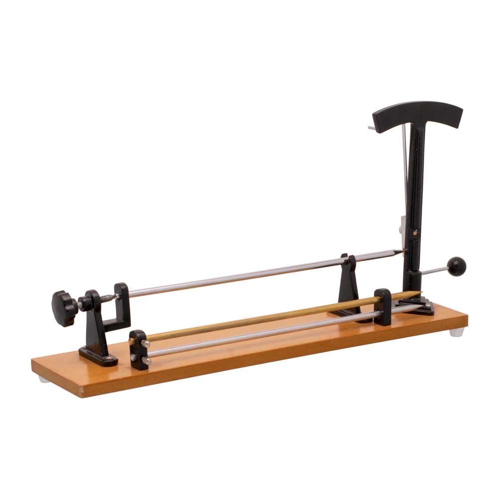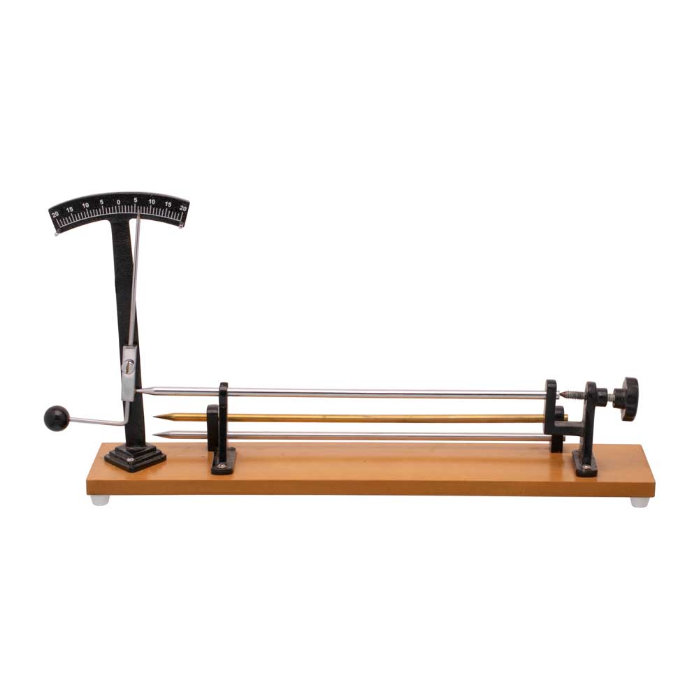 Fitted on a wooden base cast metal uprights and rod mountings. A 20-0-20 scale is provided to notice the expansion in rods. The counterweighted needle is used for easy reading. A knurling screw is provided for zero adjustment. Supplied with three metal rods one of each Aluminium, Brass and Steel.