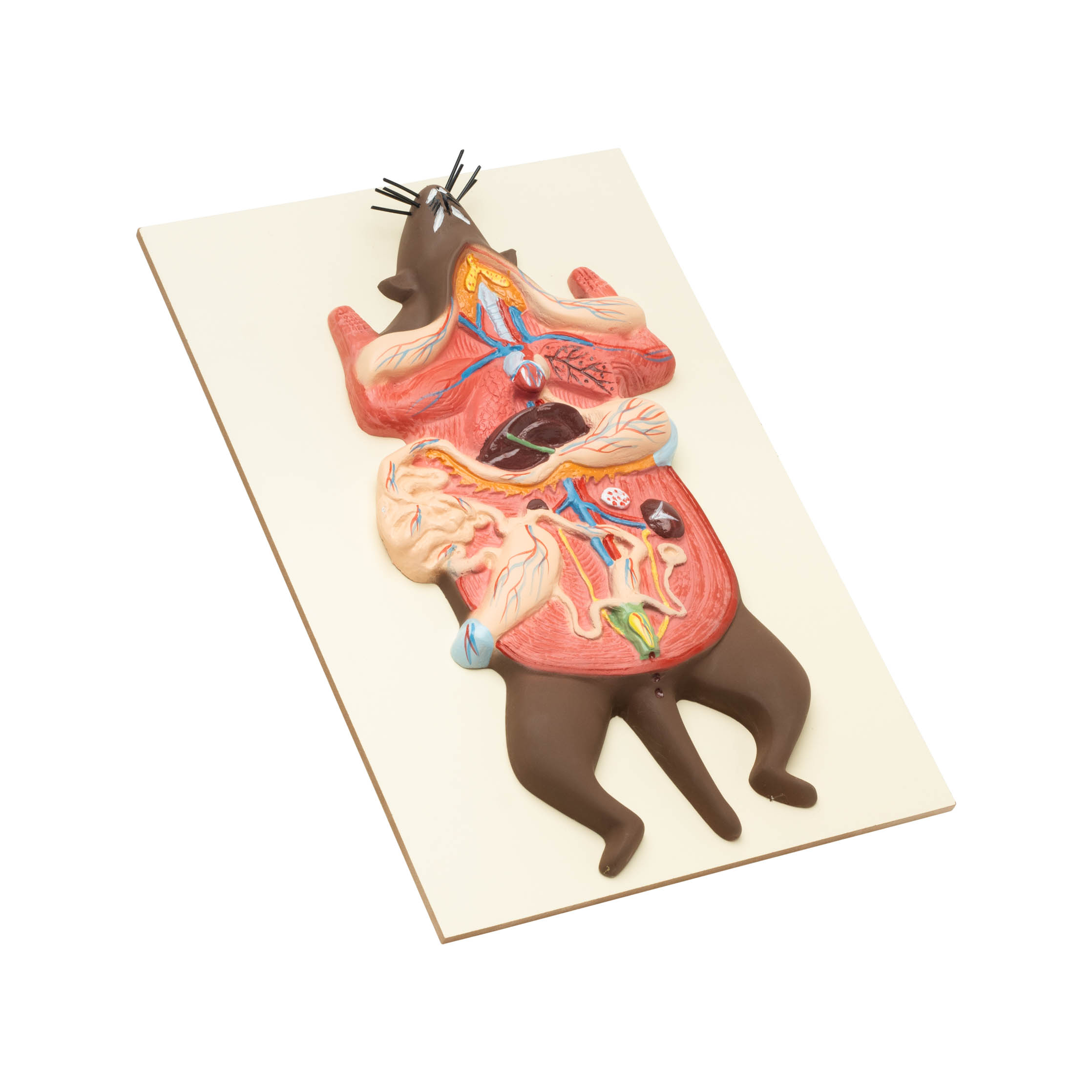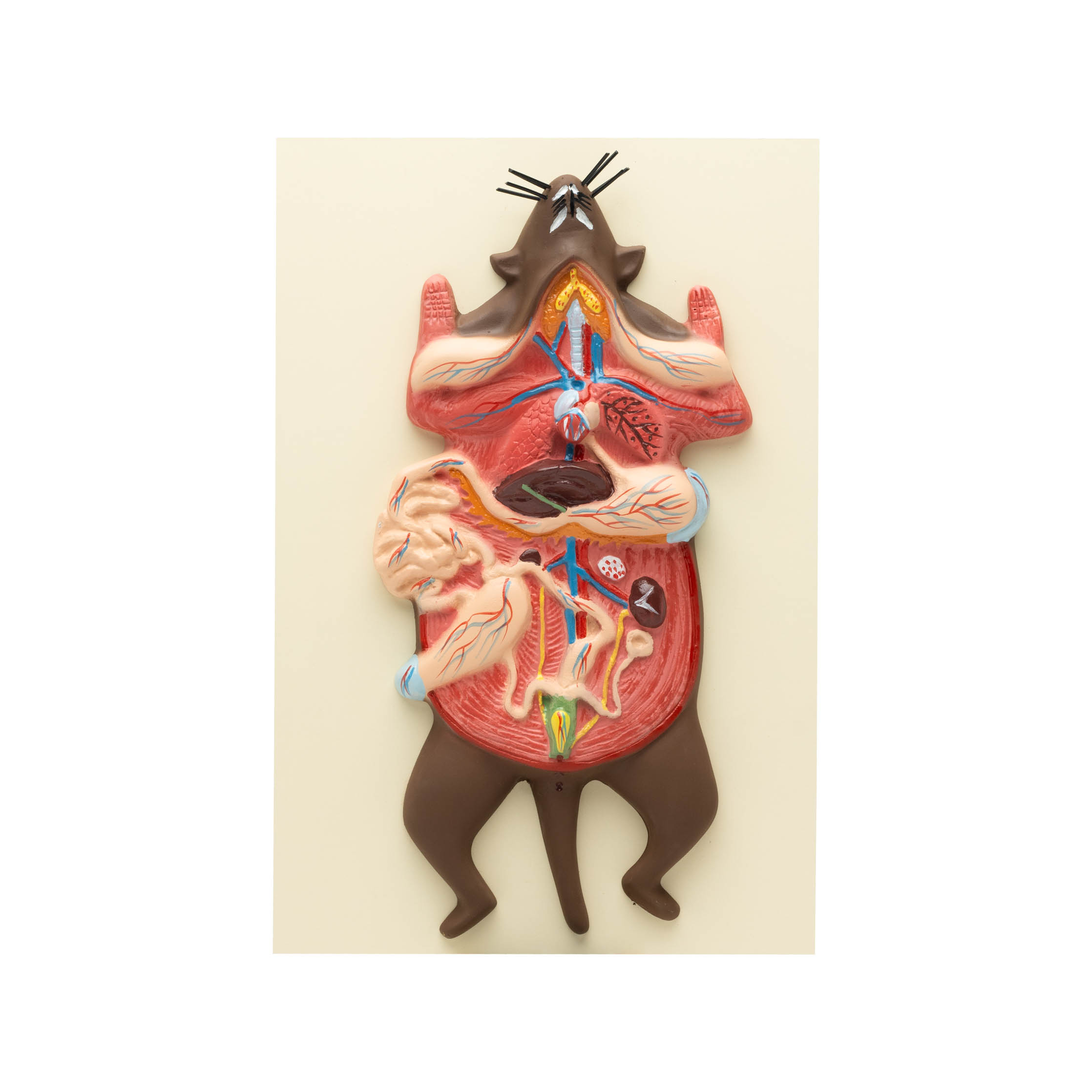 Dissection of the domestic rat showing the internal viscera, chief systems, alimentary canal and its various parts, with glands, circulatory, respiratory, excretory and the female genital organs. The head is longitudinally cut to show the brain, buccal and nasal cavities, mounted on board, with key card.