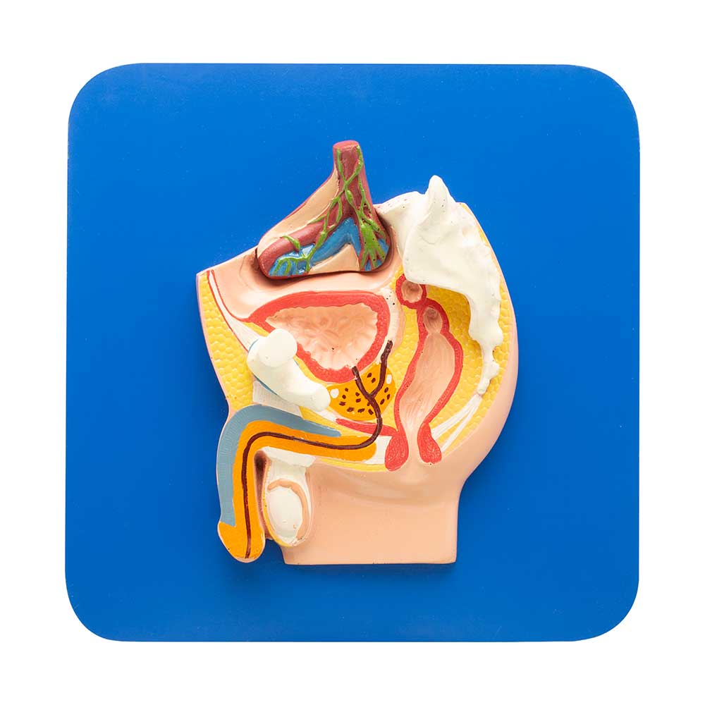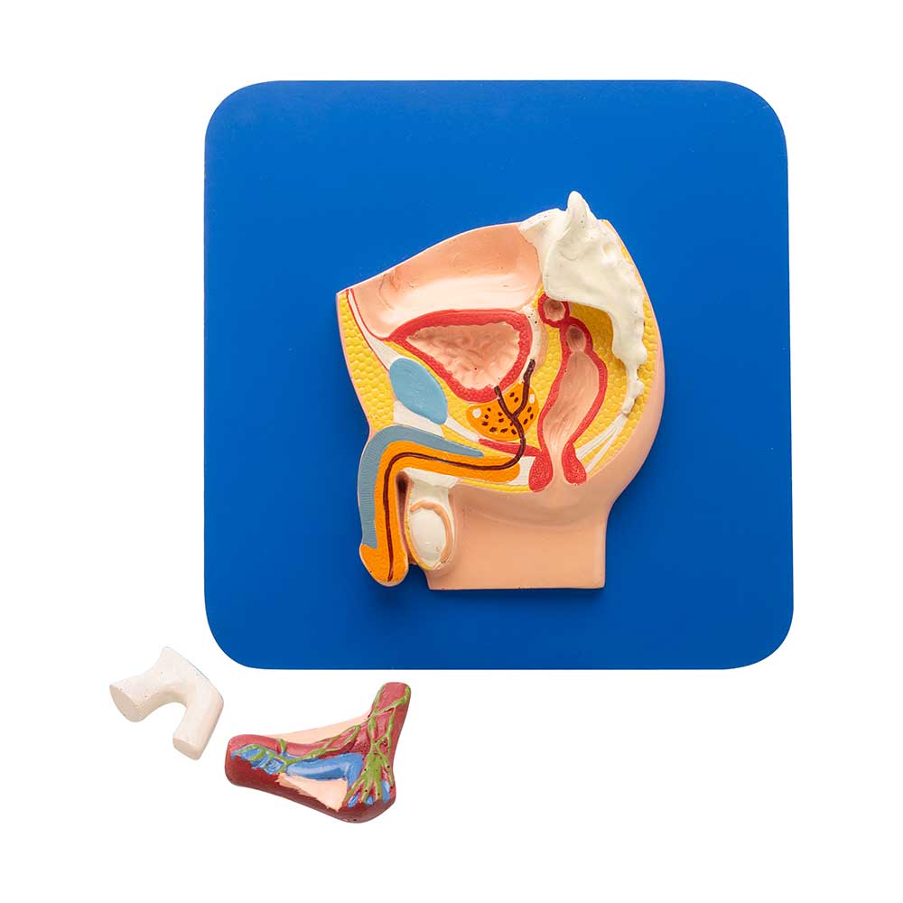 The male genital organs in normal position. Magnetic model dissectable in 2 parts with magnetic parts. The model mounted on base with key card.