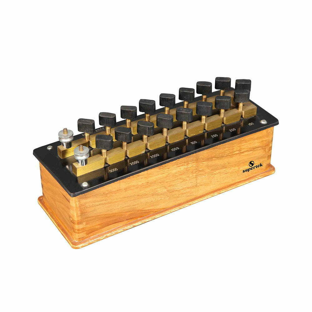 All plugs are turned to a fine standard taper and are interchangeable. These are moulded in fluted plastic tops. The brass blocks are undercut and are fitted to a thick insulating plate. Heavy 4 mm brass terminals are used. Coils are non-inductively wound and are treated to be strain-free. Coil values are engraved on the plate and an infinity plug is also included. Accuracy ±0.5% for 0.01 to 0.05 ohm coils, ±1% for the rest.