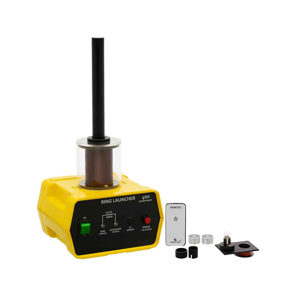 To demonstrate the Lenz’s law and effects of electromagnetically induced currents. A ring launcher consist of the base unit and built-in vertical solenoid of thick copper wire with a removeable iron core. Launch rings are provided with launcher includes: aluminum ring without split, aluminium ring with split and a plastic ring. These rings fit over the solenoid and are supported at some height above the base by an adjustable collar.