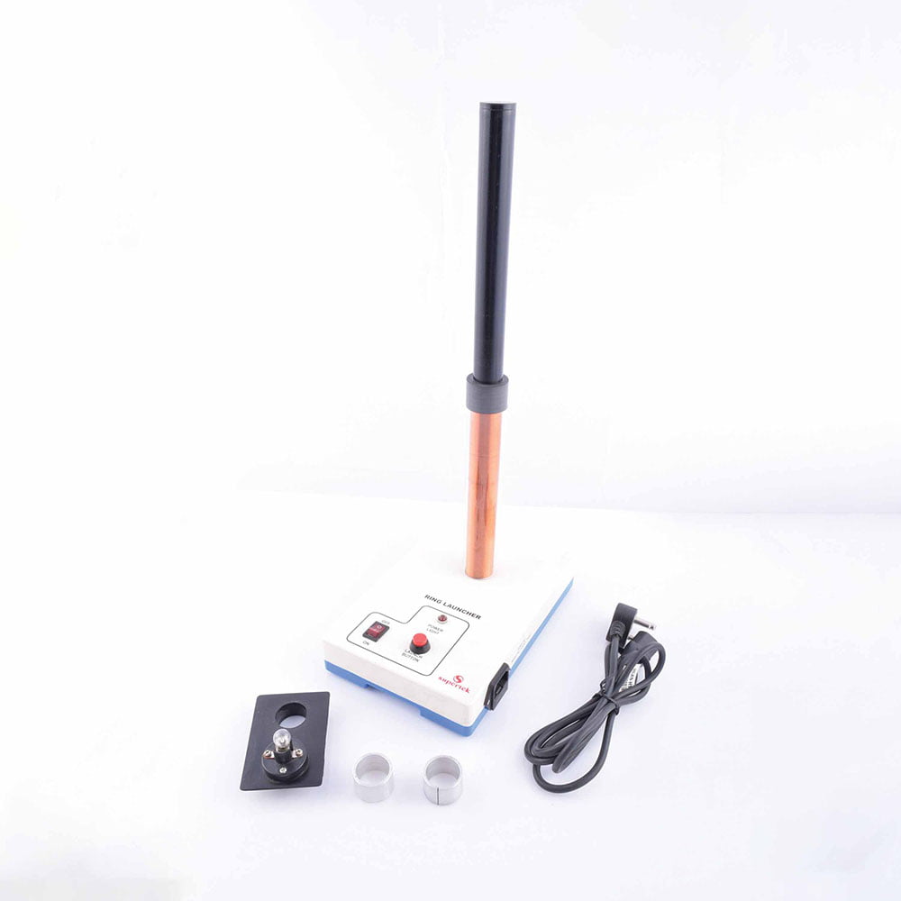 The ring launcher consists of a vertically mounted solenoid of thick copper wire with an iron core. The coil is energized with by pressing the push button on the panel. Two aluminum rings are supplied with the apparatus. These rings fit over the solenoid and are supported at some height above the base by adjustable collar. The behaviour of the rings when the coil is energized depends on the type of the ring placed over the coil at the time. The solid aluminum ring is propelled straight up while the slotted ring remains static, thus demonstrating the principle of electromagnetic induction as well as Lenz law.